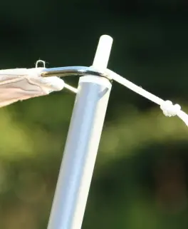 - schwere Edelstahlringe an allen vier Ecken halten das Vierecksegel und erlauben das Einhaken der Spanngurte.