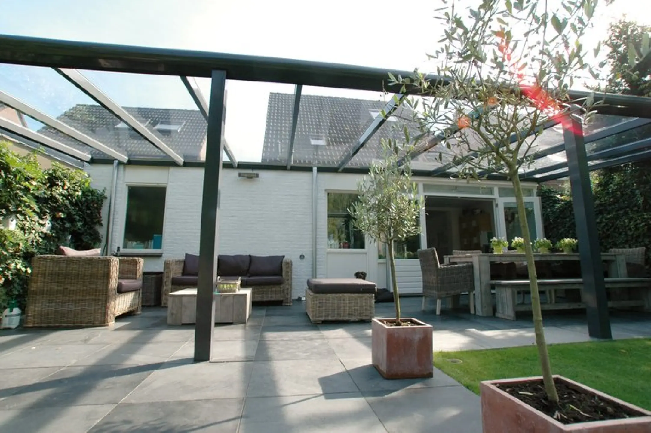 Sonnenschutzsegel für eine innenliegende Beschattung von Terrassenüberdachungen mit der Seilspanntechnik Universal speziell für die Innenbeschattung.