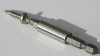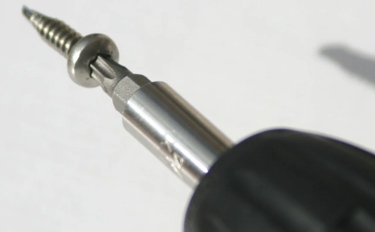 - die Bohrschraube setzt man, wie im Foto gezeigt, stabil auf den Torx-BitEinsatz und dreht mit dem Akkudreher bis zum Anschlag.