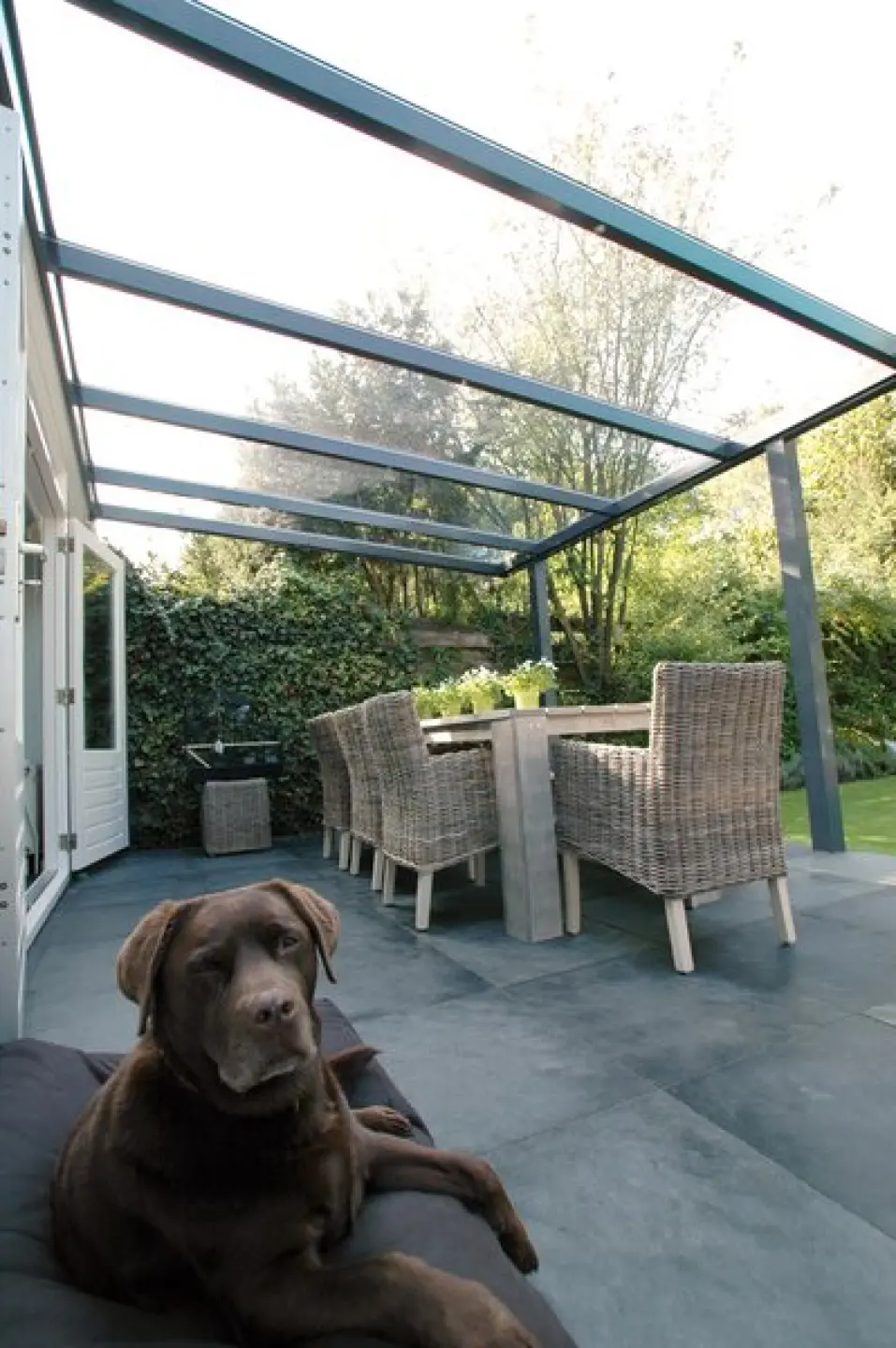 Artikel-Nr: 04-22-84-01VSonnensegel Glasdach 88 x 380 cm als Faltsonnensegel in den einzelnen Glasfächern einer Terrassenüberdachung.
