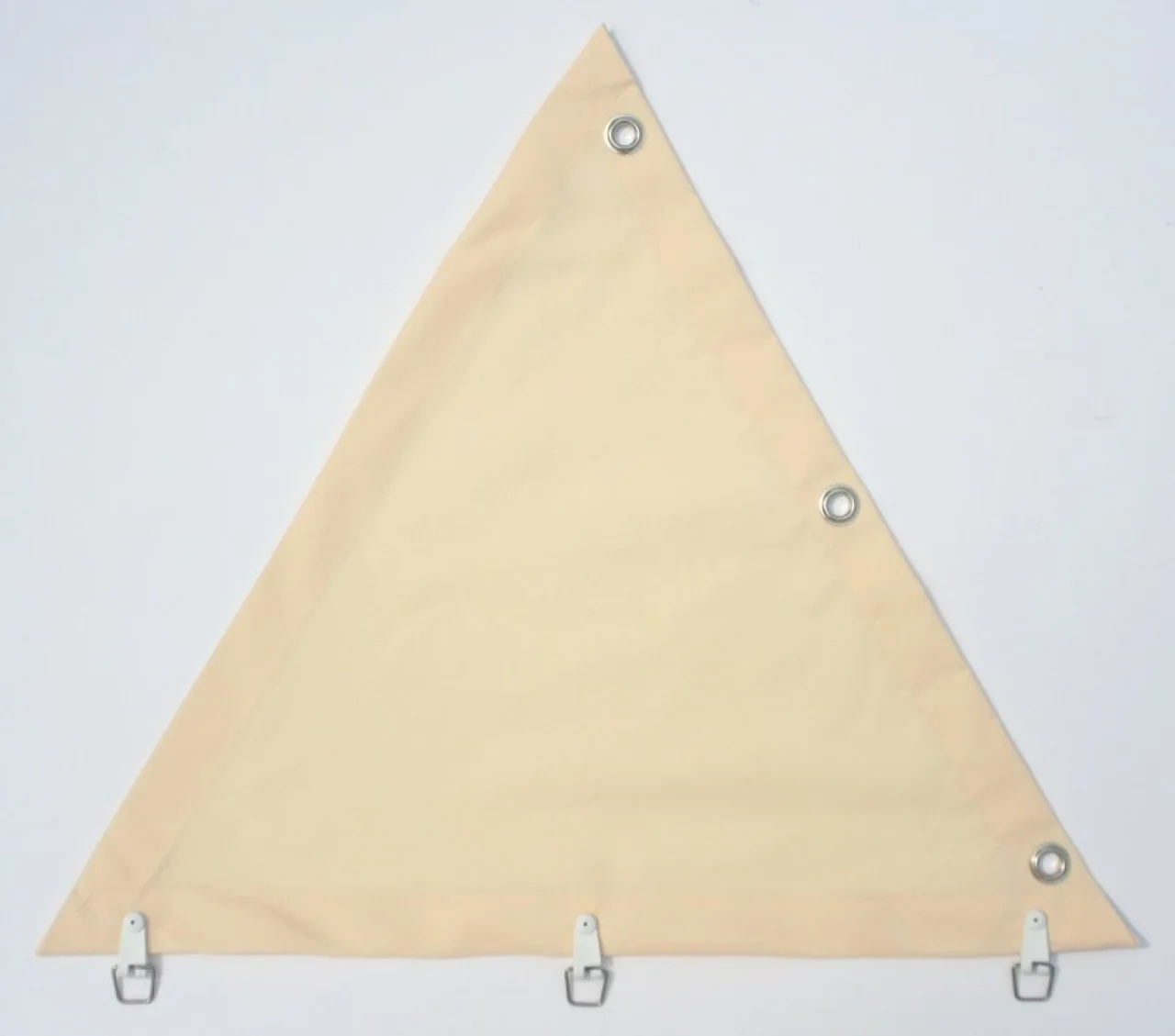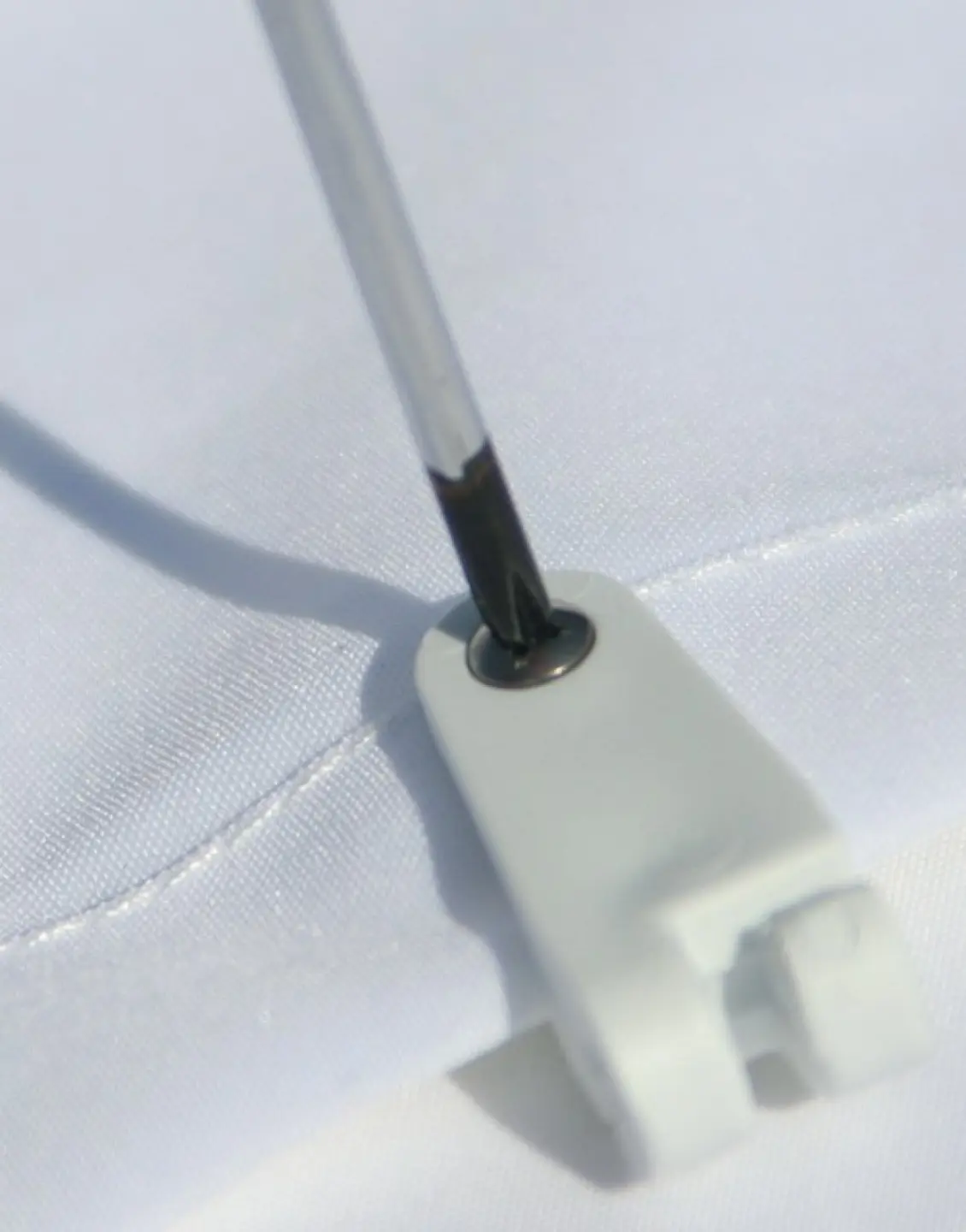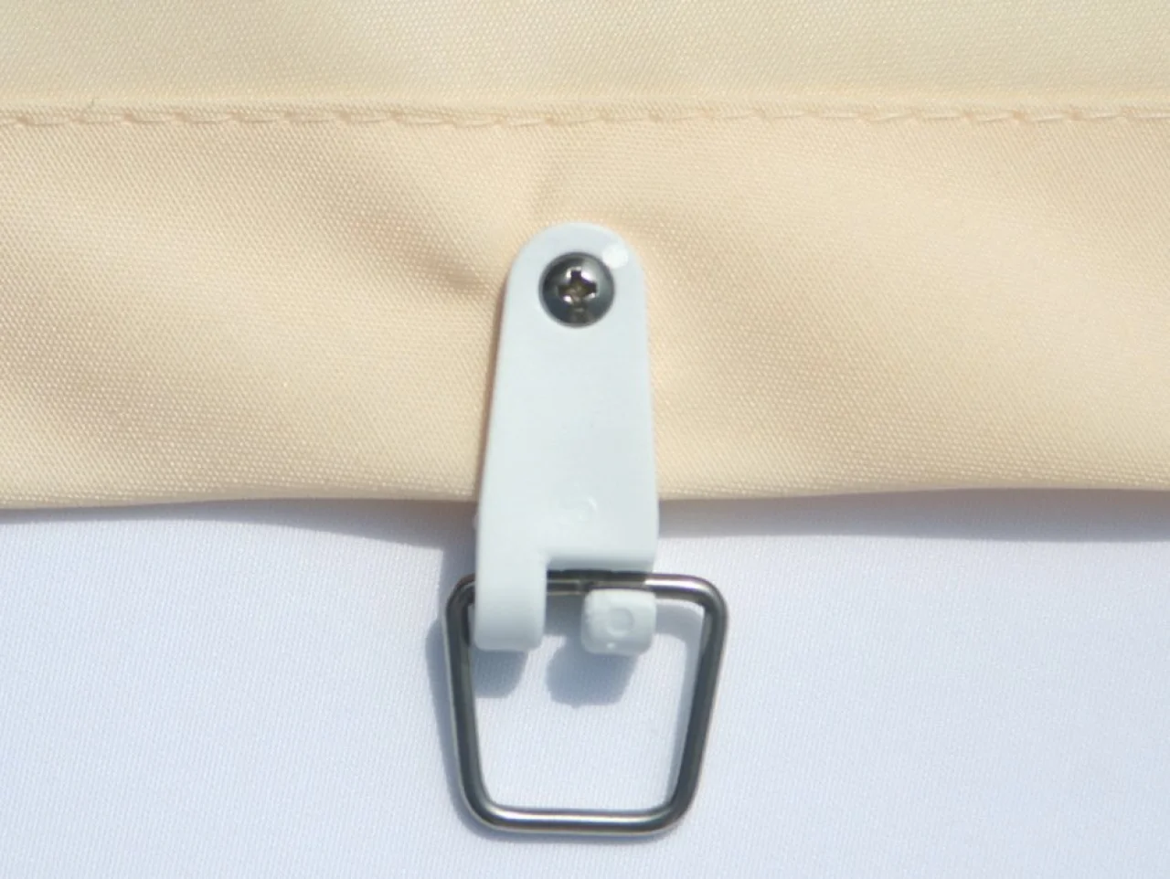 - Spezialhaken werden dauerhaft mit Edelstahlschräubchen an den dreilagig genähten Randsaum geschraubt und klemmen den Polyesterstoff ganz fest.