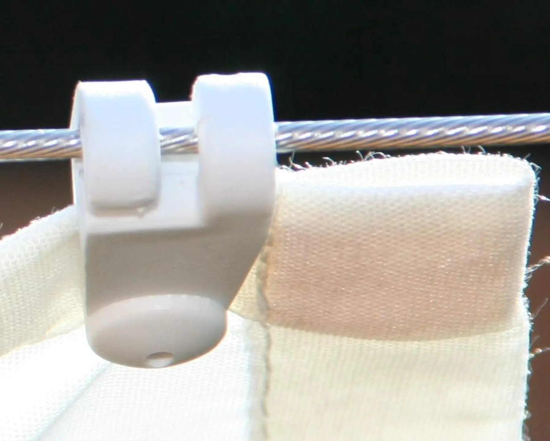 Laufhaken (Gleiter) erlauben ein Verschieben eines Sonnenschutzsegels entlang von zwei parallelen Edelstahlseilen. Das ist ein großer Vorteil gegenüber Metallösen.