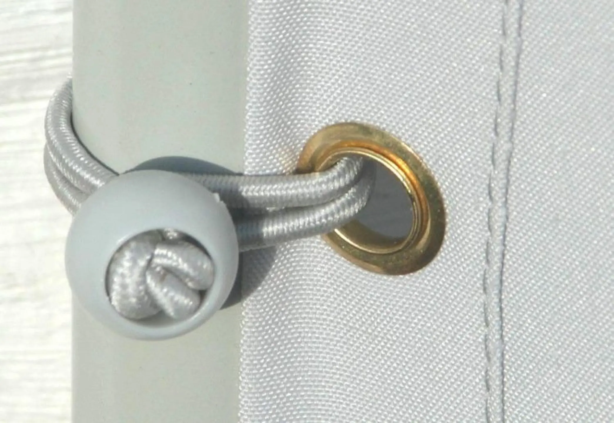 Die elastische Kordel wird doppelt durch die Metallöse gezogen, um das Senkrechtrohr des Paravent Rahmens geschlungen und über kleine ausghöhlte Kunstoffkugel gezogen. Nun kann hängt dieser Mittelteil der Bespannung fest am Paravent-Rahmen und kann sich auch bei starkem Wind nicht ablösen.