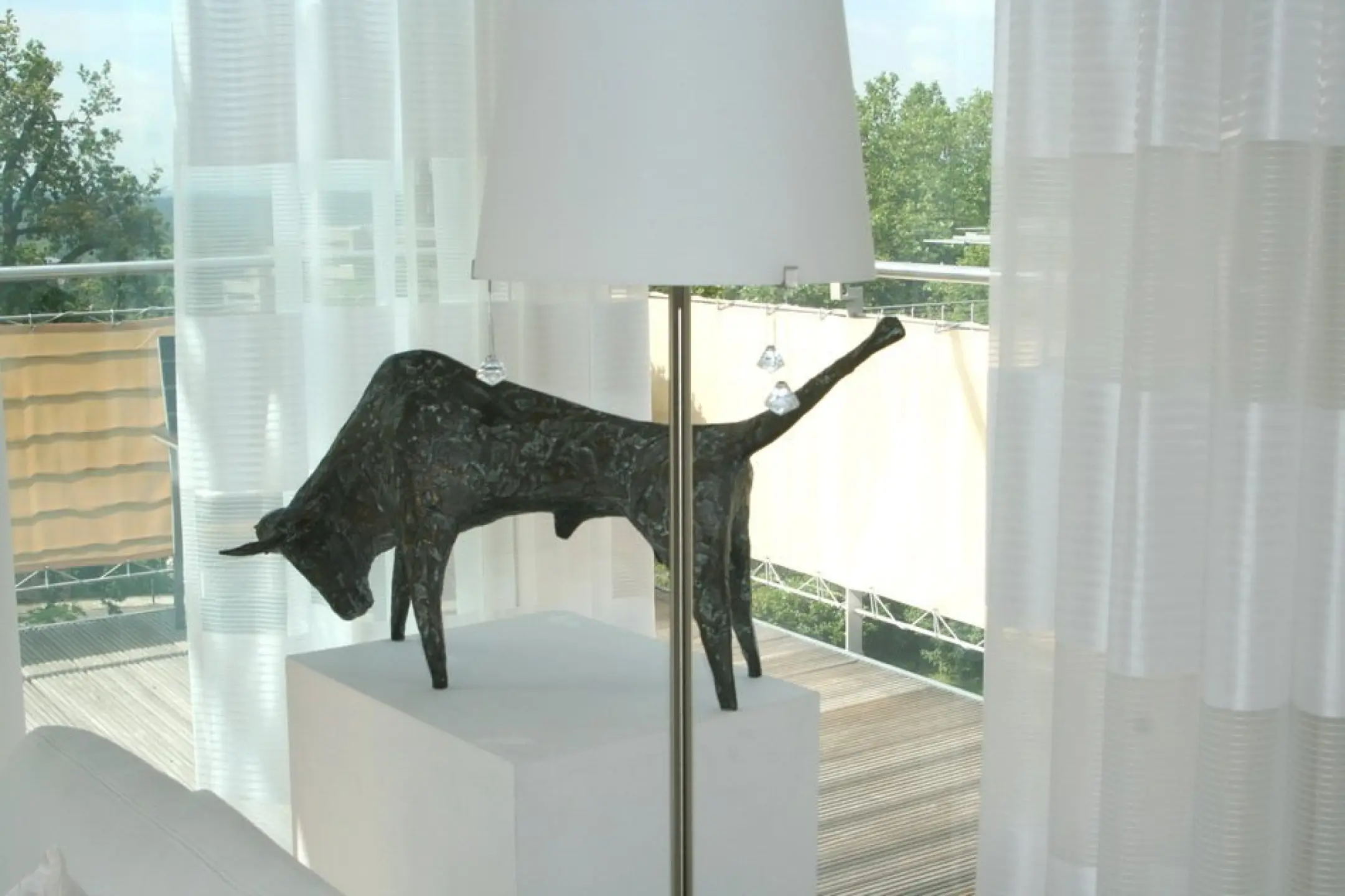 - wir haben den Polyesterstoff für die Balkonumrandung so schwer gewählt, damit er schließlich faltenfrei schön glatt gespannt hängen kann.