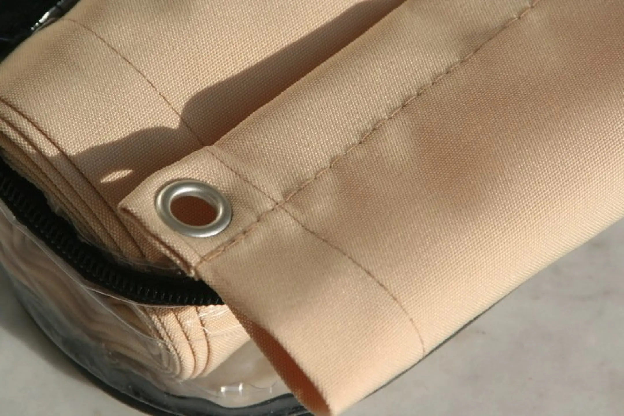 Die Metallösen sind im Abstand von ca. 24,5 cm in den 3 cm breiten Randsaum eingeschlagen. Sie haben einen Durchmesser von 10 mm und sind aus Kupfer galvanisch vernickelt und damit nicht rostend.