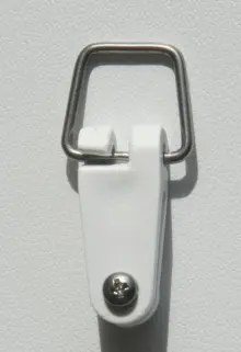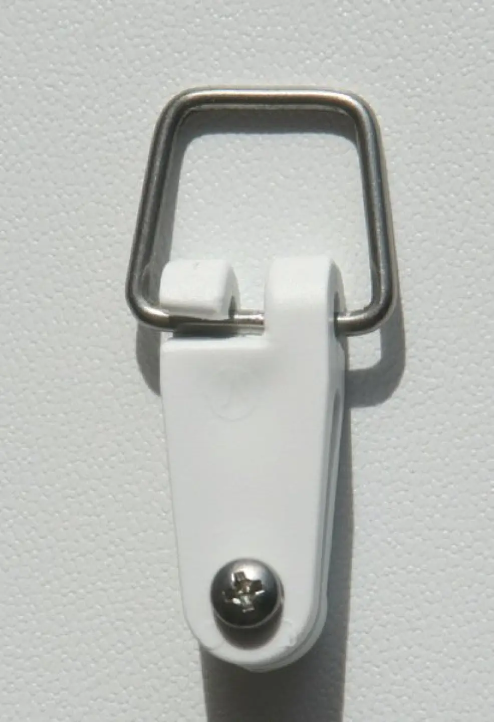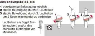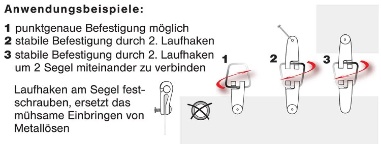 Artikel-Nr: 09-77-03-01- Laufhaken auf den Randsaum des Sonnensegels stecken und mit der Edelstahlschraube festdrehen - der Laufhaken klemmt den Stoff - der Stoff hängt nicht an der Schraube - kein Ausreißen