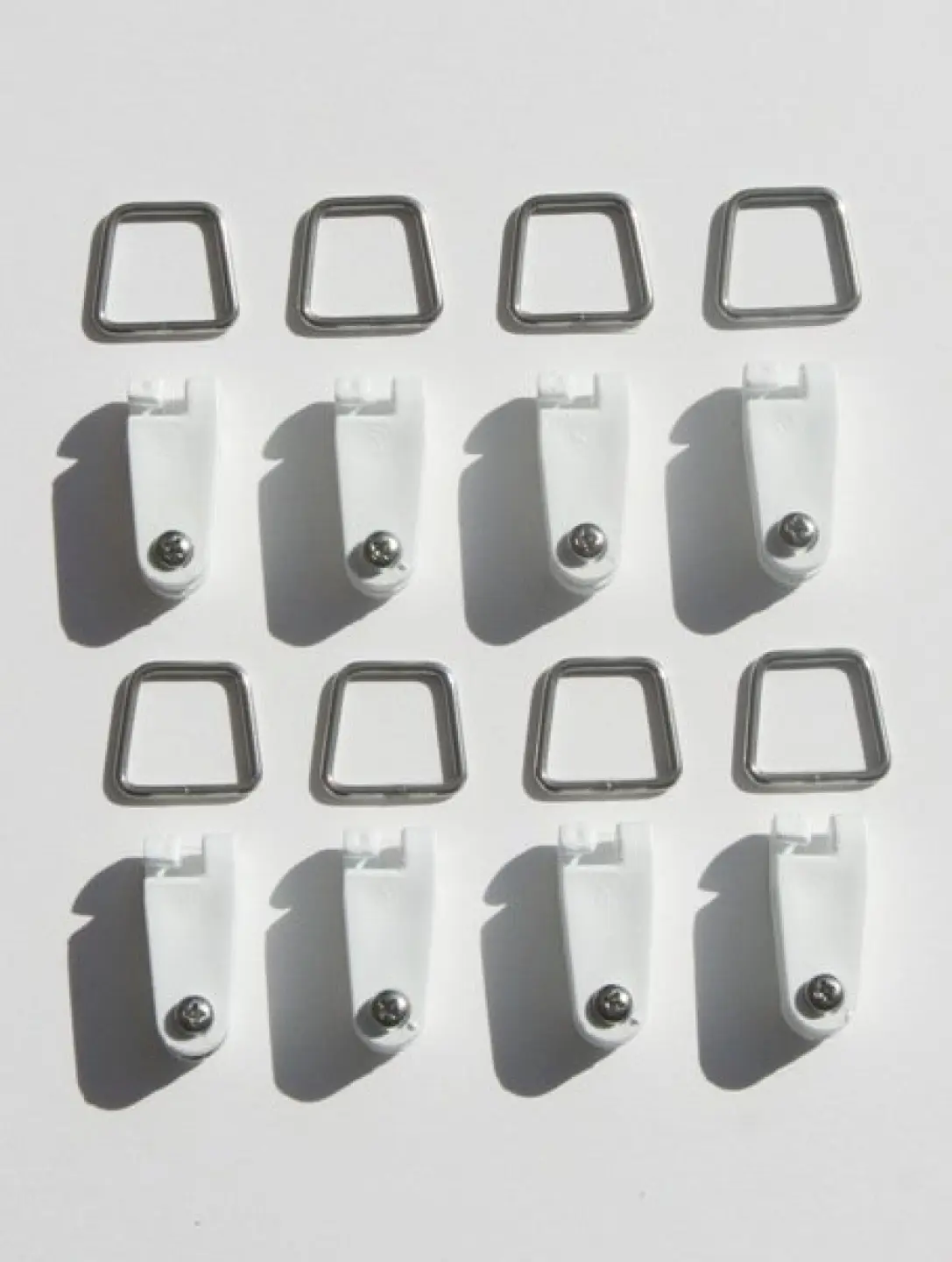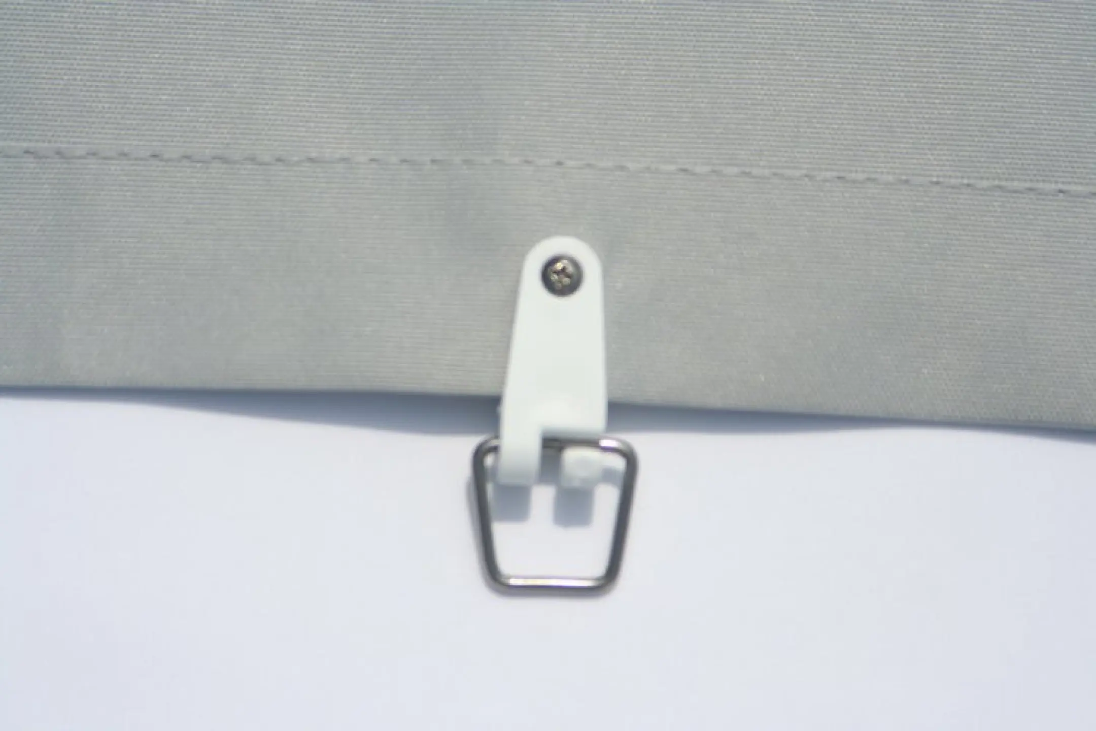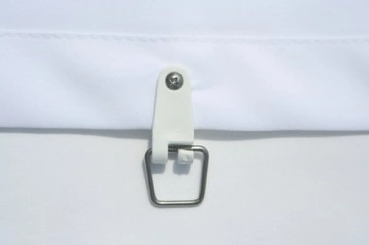 - 8x Speziallaufhaken die mit Edelstahlschrauben auf den Randsaum eines Sonnensegels mit Edelstahlschrauben dauerhaft festgeschraubt werden.