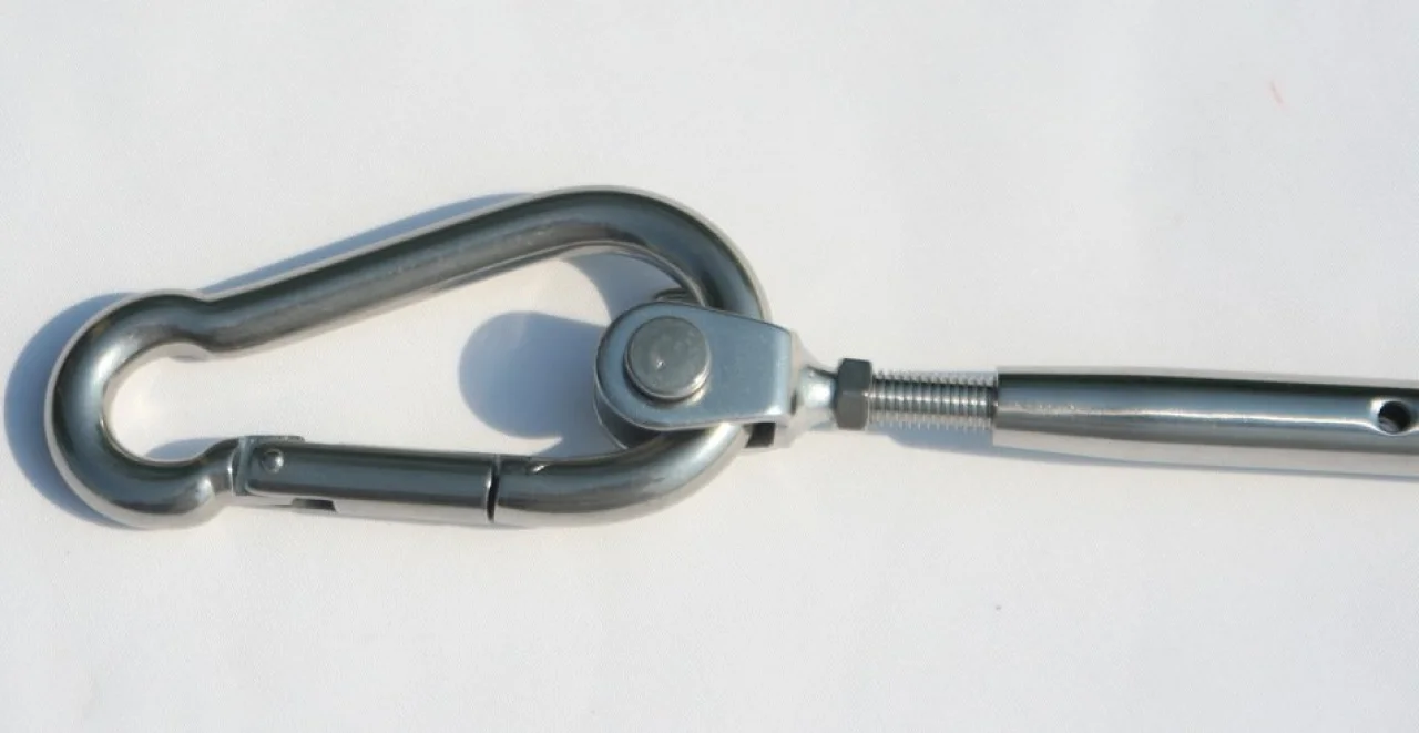 Spannschloß für Sonnensegelmontage bei großflächigen konkaven Sonnensegeln zur Verbindung vom Sonnensegel zum Befestigungspunkt.