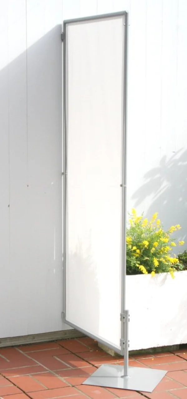 Der Klapptisch wird an die senkrechten Rahmenteile angesteckt, ist wetterfest und kann mit den Paravent Rahmen zusammen