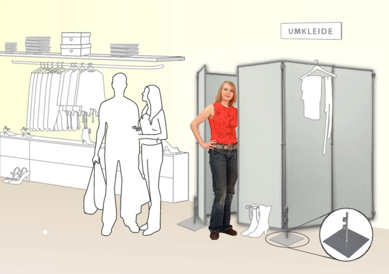 Eine solch mobile und flexible Umkleide - Umkleidekabine können Sie nur mit dem patentierten Sichtschutz Paravent zuammen stecken: als Massagekabine, Pressekabine, Erste-Hilfe-Kabine etc.