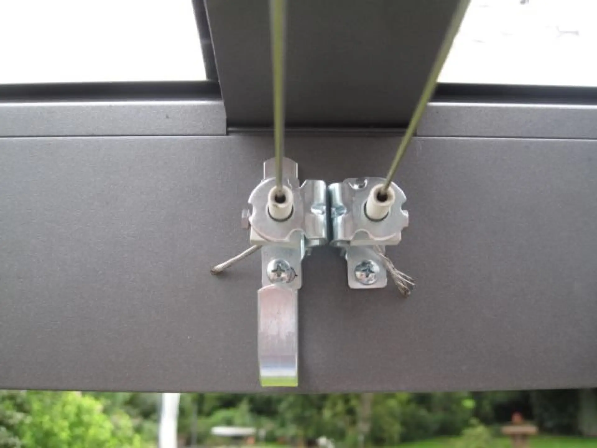 - an der Spannschraube kann nichts rosten, weil sich nur Teile aus Edelstahl oder Kunststoff berühren (was ein wieder Lösen der Seilfixierung auch nach Jahren erschweren könnte (so nur bei uns!); dies ist wichtig, weil eine Änderung der Seilaufhängung oder evtl. ein Umzug eine Demontage und Wiederaufbau erfordern - kein Problem.