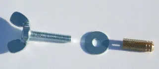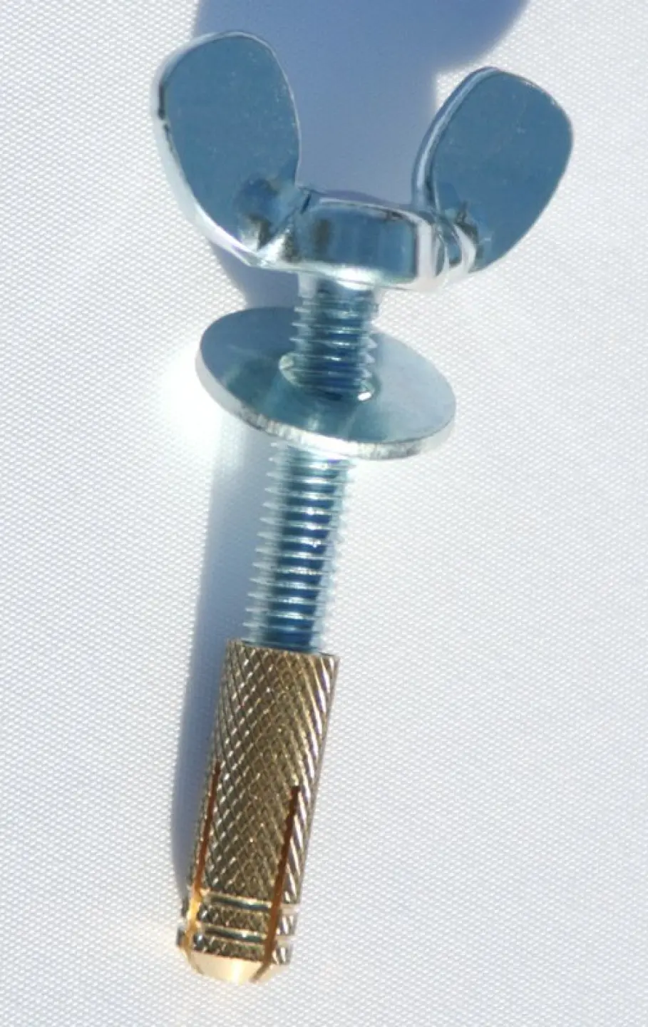 Sie benötigen einen Steinbohrer 8 mm. In das Bohrloch lassen Sie den Messingdübel ein. Rutscht er durch, halten Sie ihn mit der Flügelschraube so, daß er in der Mitte vom Bohrloch positioniert ist und drehen mit der Flügelschraube bis zum ersten Widerstand, wenn die Schraube den Dübel anfängt zu spreizen und gegen die Bohrwand drückt. Dann können Sie die Schraube festdrehen oder mit leichten Schlägen tiefer eindrücken, wenn das Festdrehen zu schwer wird.