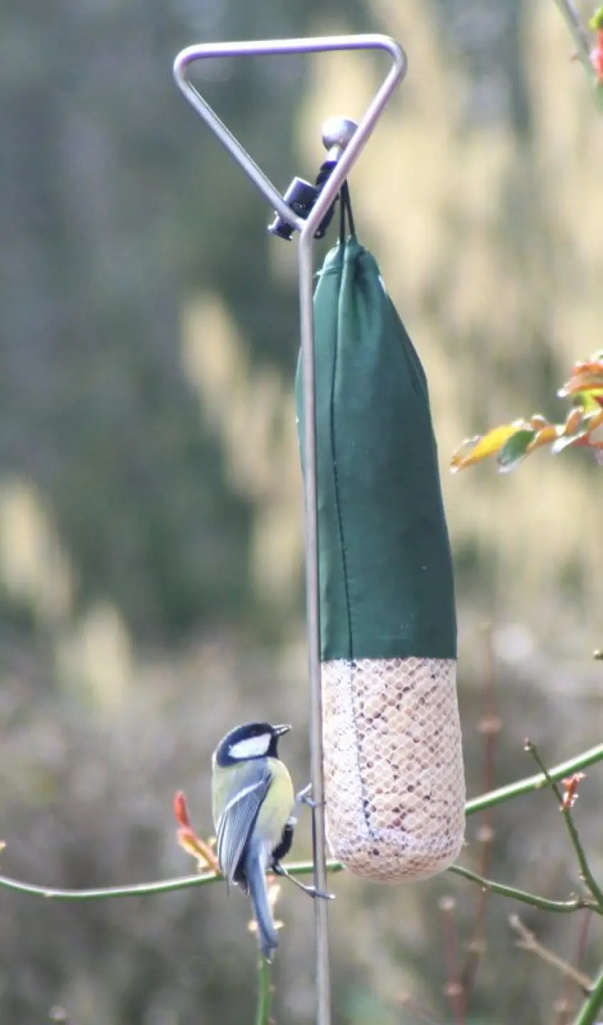 Die Vögel, vor allem Meisen lieben den 6 mm Rankstab als Futterplatz und fliegen den senkrechten Teil vom Rankstab gerne von der Seite her an, um direkt am unteren Teil vom Meisenknödel zu landen.