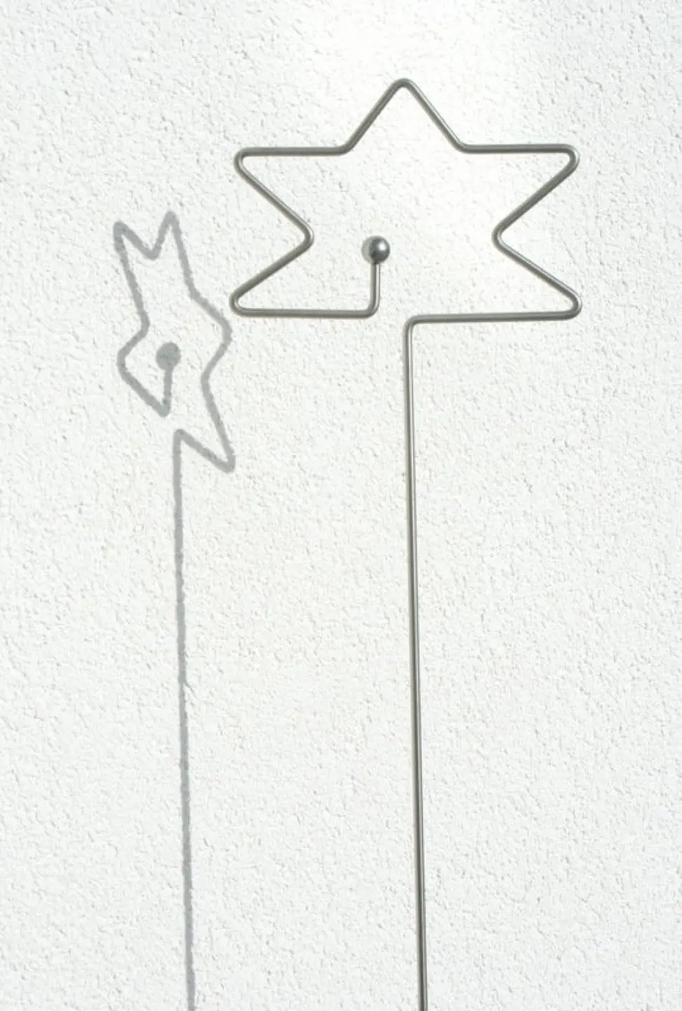 Rankstab Stern mit offener Stabführung von dem 6 mm Edelstahlrundstab, um leichter etwas größere Gegenstände anhängen zu können; das ist bei den Netzen von Meisenknödel oft erforderlich.