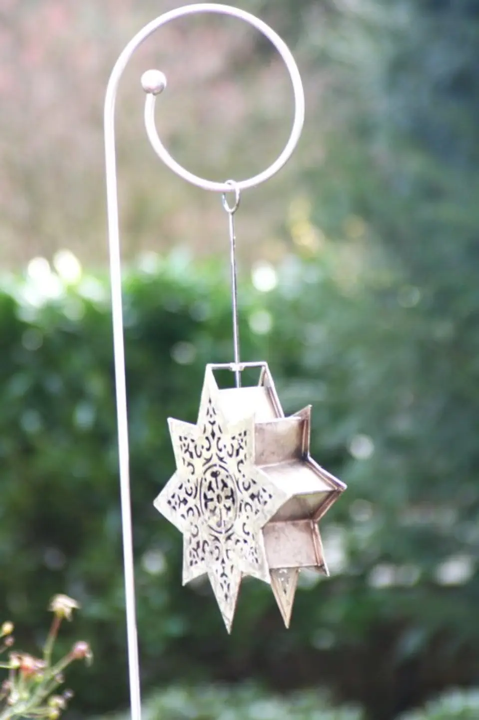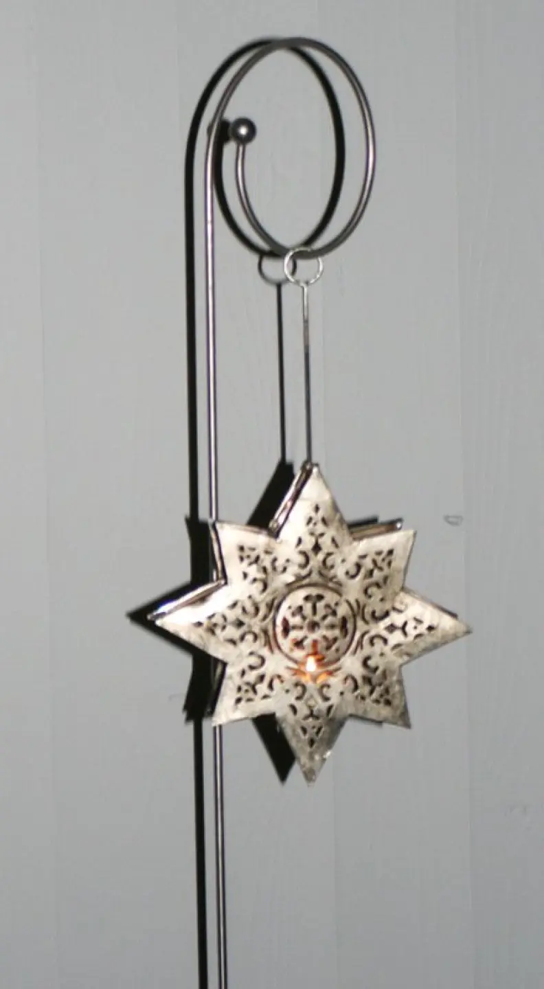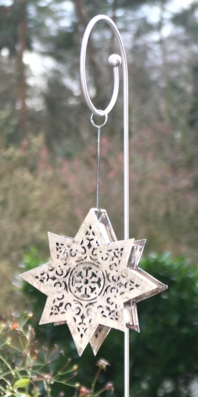 Die offene Windung erlaubt das Anhängen völlig veschiedener Gegenstände, ohne daß der Rankstab einfach zum Haken wird. Wir zeigen Ihnen eine groß Lichtampel versilbert die mit dem Hirtenstab einfach schön aussieht.