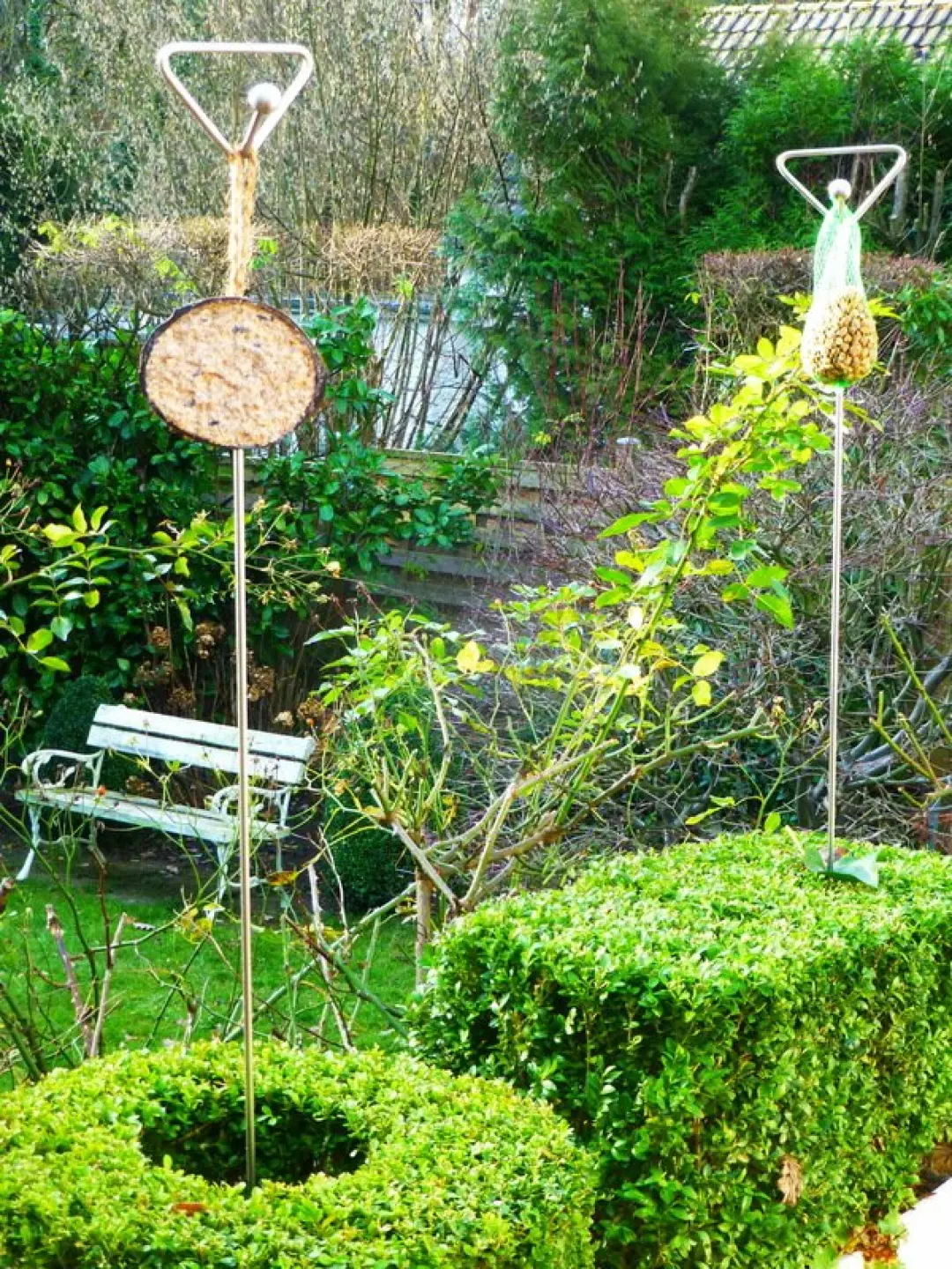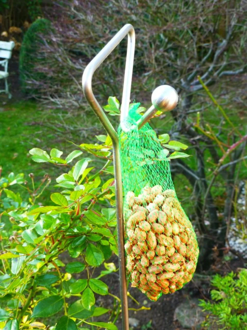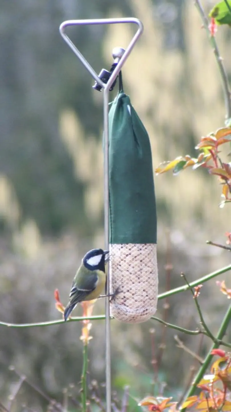 Die Vögel, vor allem Meisen lieben den 6 mm Rankstab als Futterplatz und fliegen den senkrechten Teil vom Rankstab gerne von der Seite her an, um direkt am unteren Teil vom Meisenknödel zu landen.