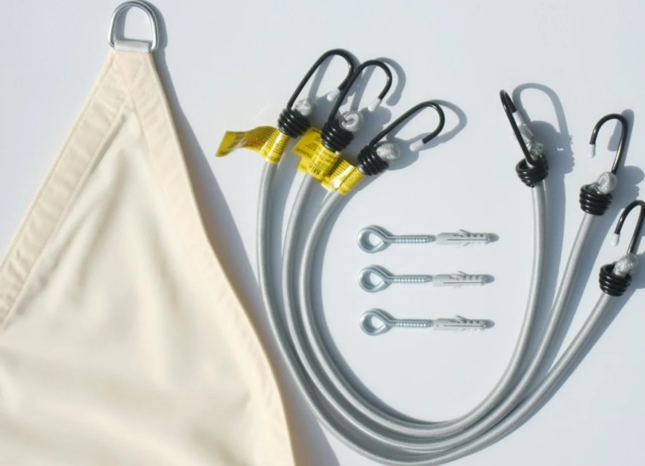 - Komplettes Montagematerial für das Dreiecksegel mit dauerelastischen Spanngurten für eine schnelle und windstabile Sonnensegelmontage