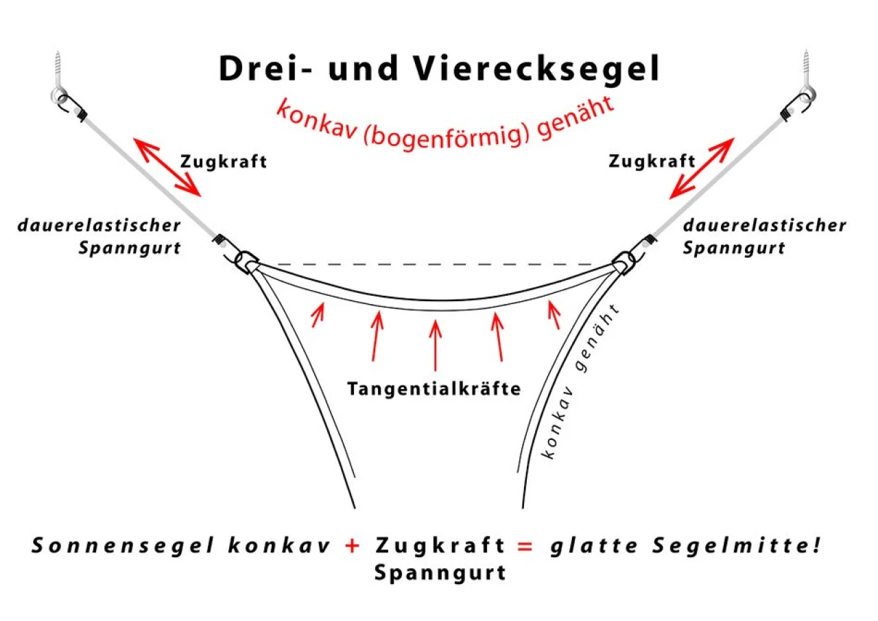 - konkav (bogenförmig von den Ecken zu Segelmitte nach innen genäht) mit Randverstärkung und stabilen Edelstahlringen an den Ecken