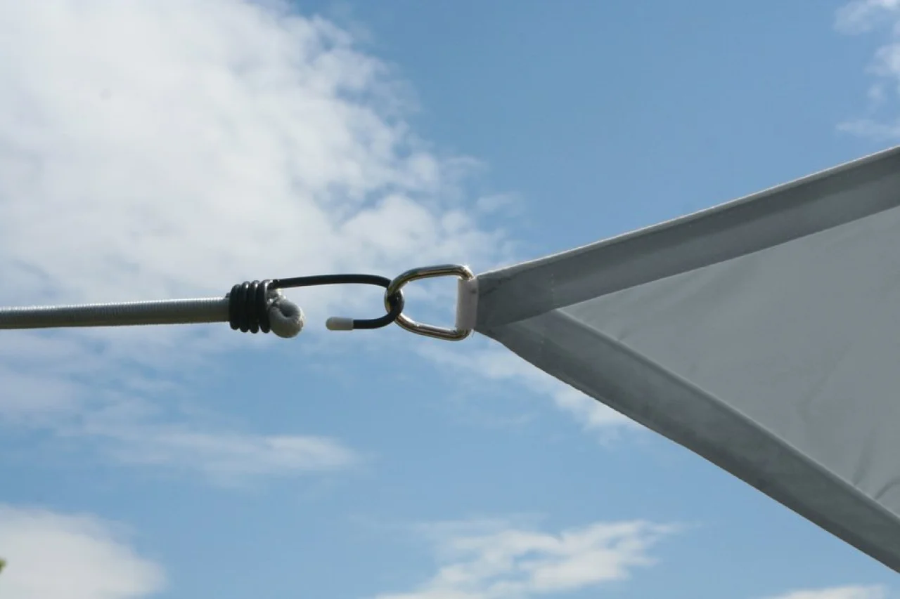 - Komplettes Montagematerial für das Dreiecksegel mit dauerelastischen Spanngurten für eine schnelle und windstabile Sonnensegelmontage.