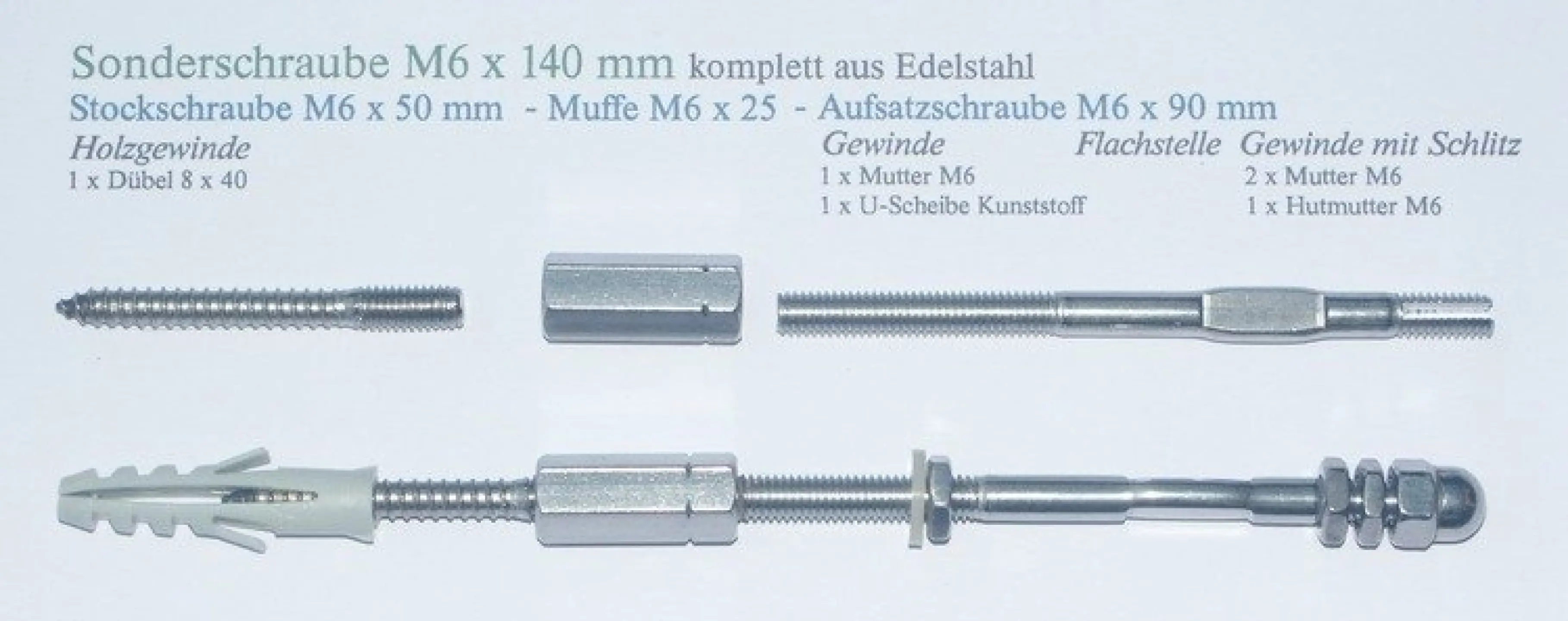 Die Montage der Aufsatzschraube Rankhilfe erfolgt analog zur standardmäßigen Doppelchraube, deren Oberteil absolut identisch ist mit der Aufsatzschraube nur, daß das Unterteil bei der Aufsatzschraube auch metrisches M6 Gewinde trägt, im Gegensatz zum Holzgewinde bei der Doppelschraube.