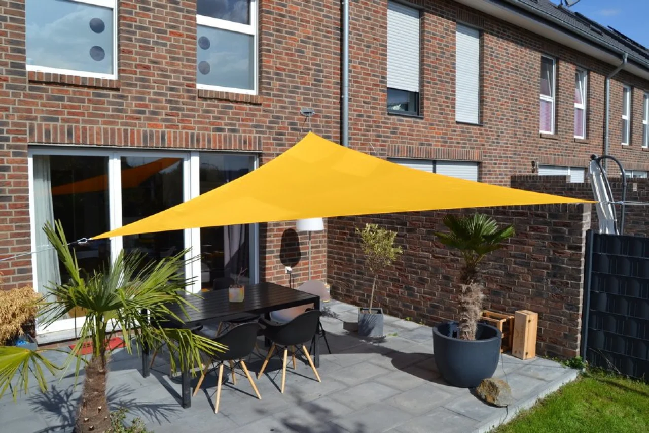 - Dreiecksonnensegel mit gleichfarbiger Randverstärkung, unterlegt mit schweren Gurten zum tragenden Metallring an der Ecken des Dreiecksonnensegels