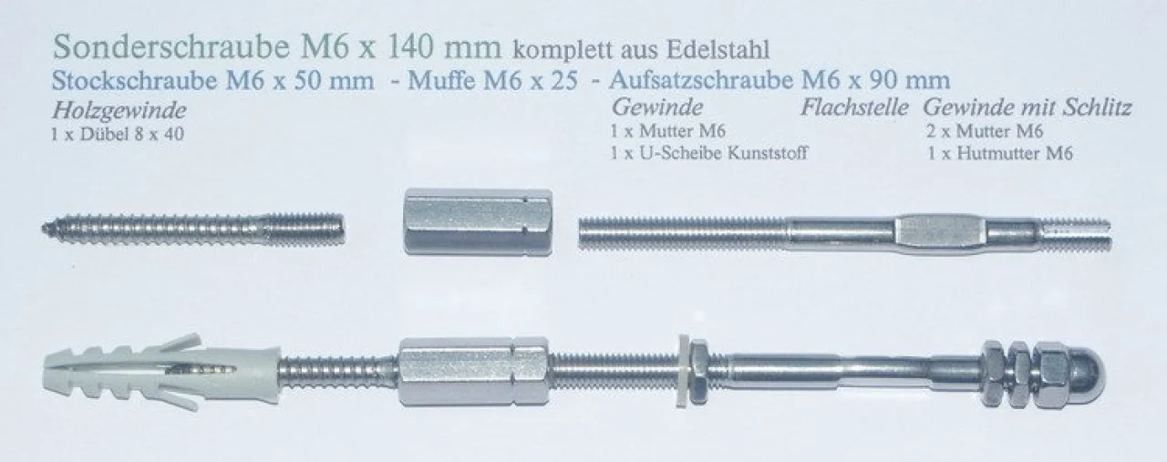 1. 1x Stockschraube (M6x50 mm) aus Edelstahl mit wandseitigem Holzgewinde für die Montage in Holz oder mit Dübel 8x40 mm für Mauerwerk/Beton - oben mit metrischem Gewinde M6 zur Verbindung mit der oberen Aufsatzschraube M6x90 durch eine Muffe