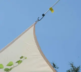 Geteilte Metallstange als Montagehilfe zum Aufstellen des Vierecksonnensegels, wenn ein dritter und auch vierter Fixpunkt fehlt.