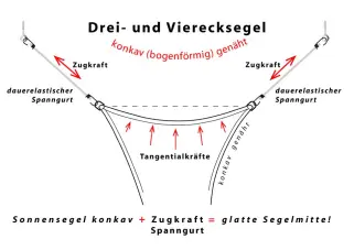 Konkave Vierecksegel werden über die Segelecken ausgespannt. Die 4x Dauerelastische Spanngurte vermitteln die notwendige Dauerspannung, um den Polyesterstoff aus der Segelmitte heraus glatt zu spannen. Zusätzlich schützen die elastischen Spannelemente das Sonnenschutzsegel vor schädigenden Windböen.