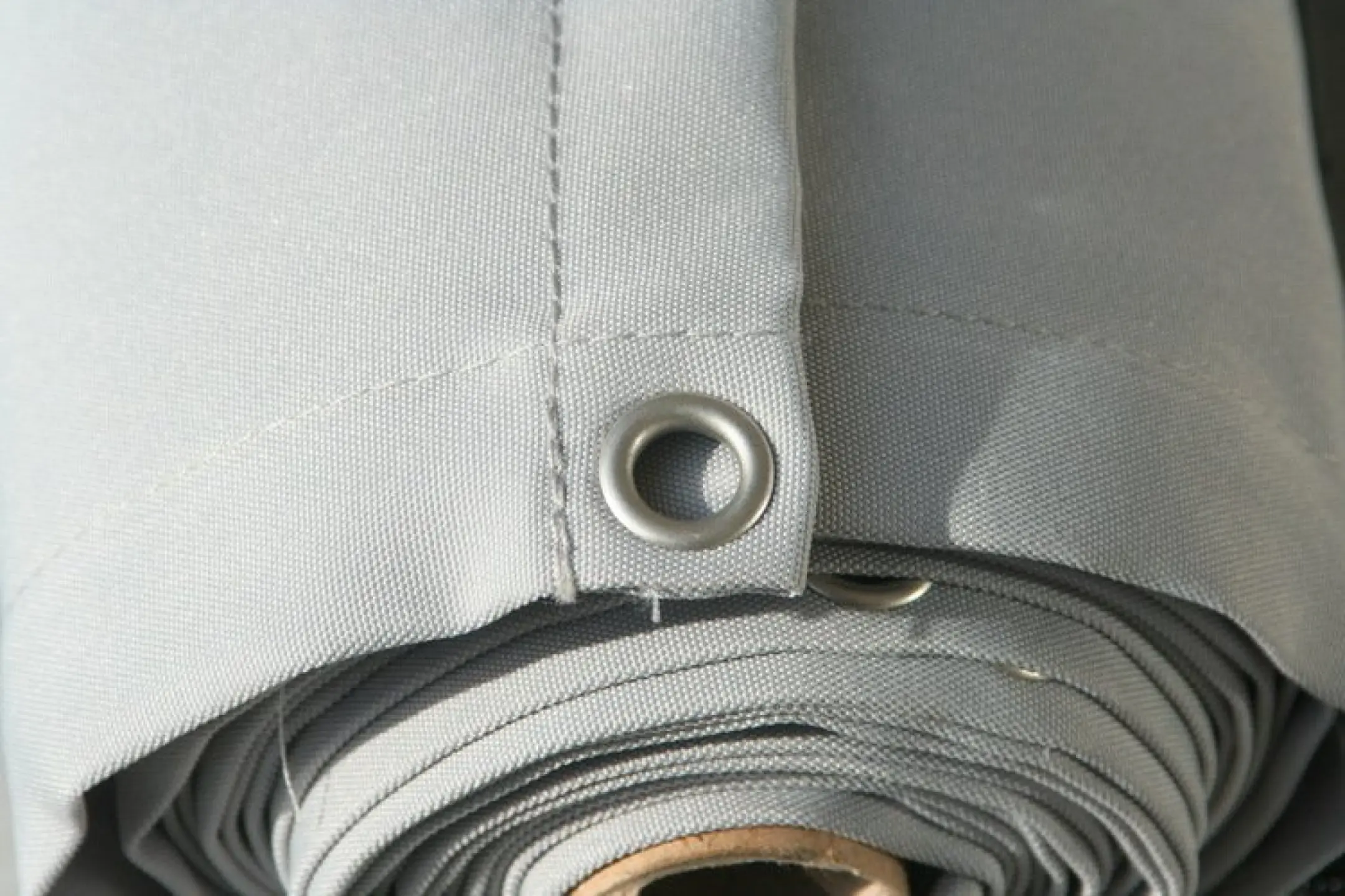 Die Metallösen sind im Abstand von ca. 24,5 cm in den 3 cm breiten Randsaum auf allen vier Seiten eingeschlagen.