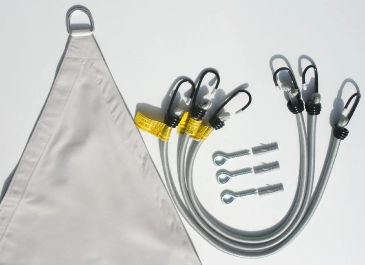 - Komplettes Montagematerial für das Dreiecksegel mit dauerelastischen Spanngurten für eine schnelle und windstabile Sonnensegelmontage.
