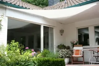 Montage über der Terrasse. Bei einer Montage über der Hausterrasse wird die Hauswand oder idealerweise auch Dachsparren zwei Montagepunkte zum Auspannen eines Dreiecksegels bieten. Schwierig kann es mit dem dritten Montagepunkt werden - hier kann die Metallstange aushelfen und kurzfristig den fehlenden Fixpunkt für das Sonnensegel ersetzen.