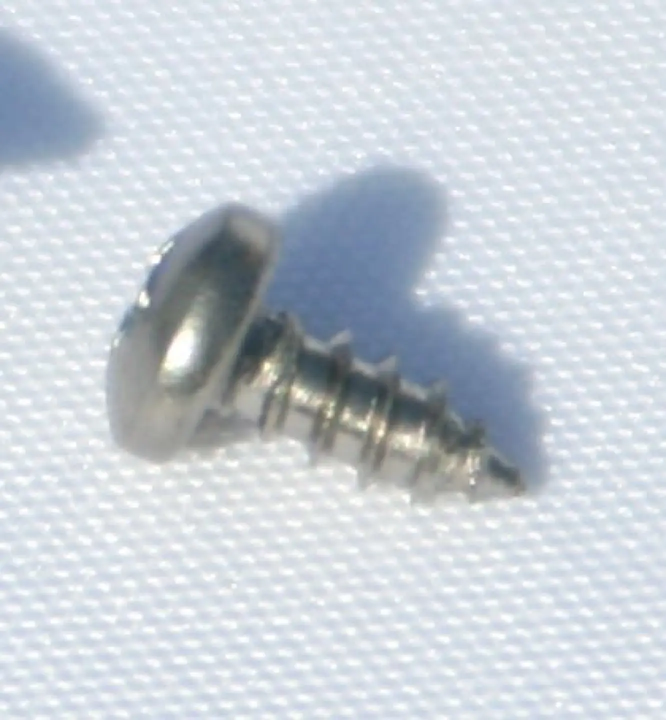 Stecken Sie eine Edelstahlschraube in die kleine Vertiefung der Laufhaken ein und drehen Sie sie mit einem kleinen Kreuzschraubendreher richtig fest - so, daß der Laufhaken wirklich im rechten Winkel zum Randsaum steht - sonst hakeln die Laufhaken beim Verschieben des Segels.