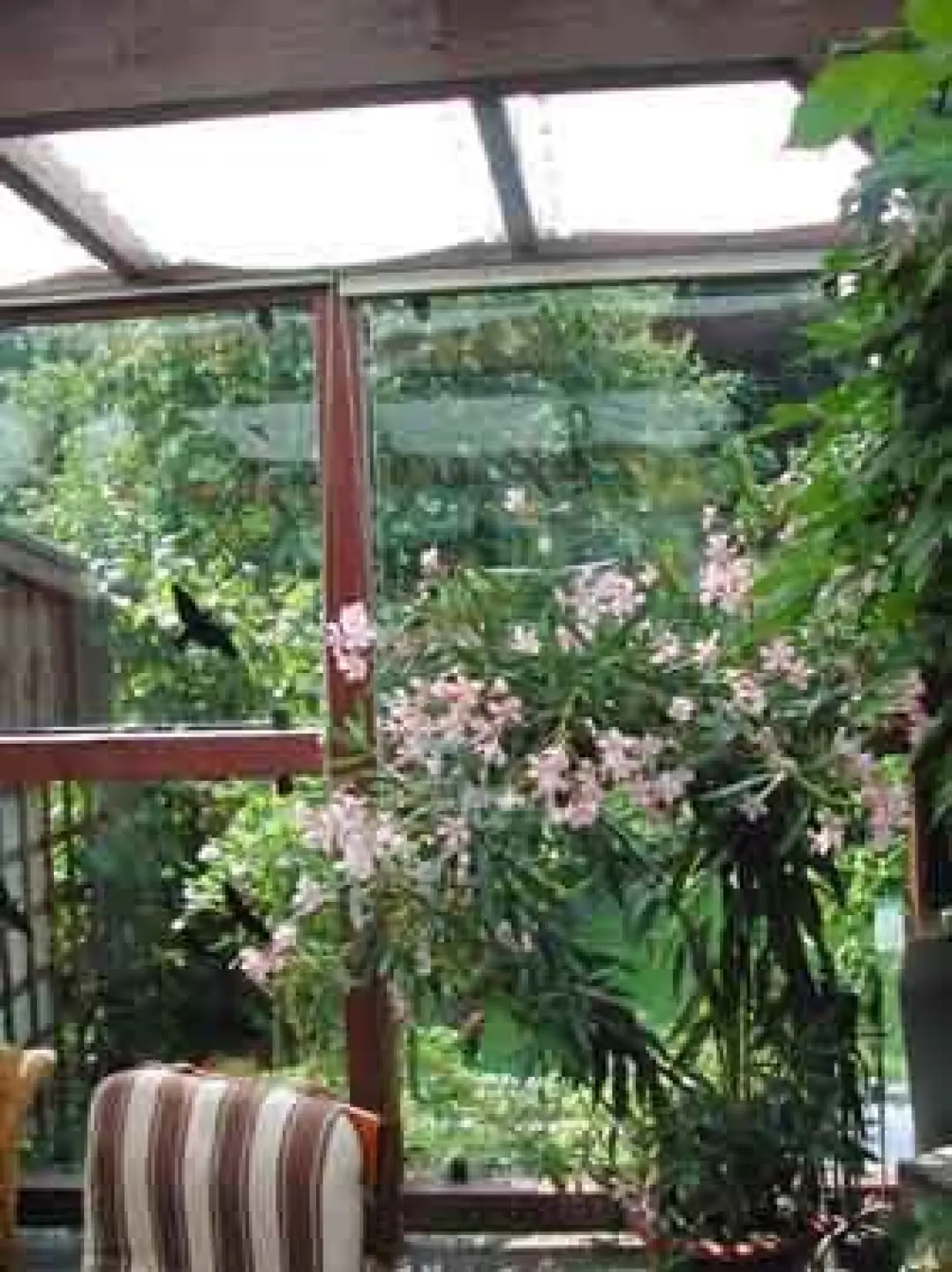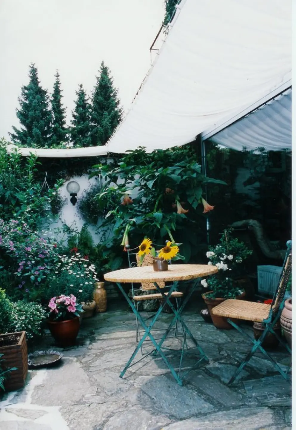 Regenschutz durch eine schräge Aufhängung des Sonnensegels - bitte das Segel nie ohne Glasabdeckung waagerecht aufhängen, weil sich sonst bei Regen Wassersäcke bilden