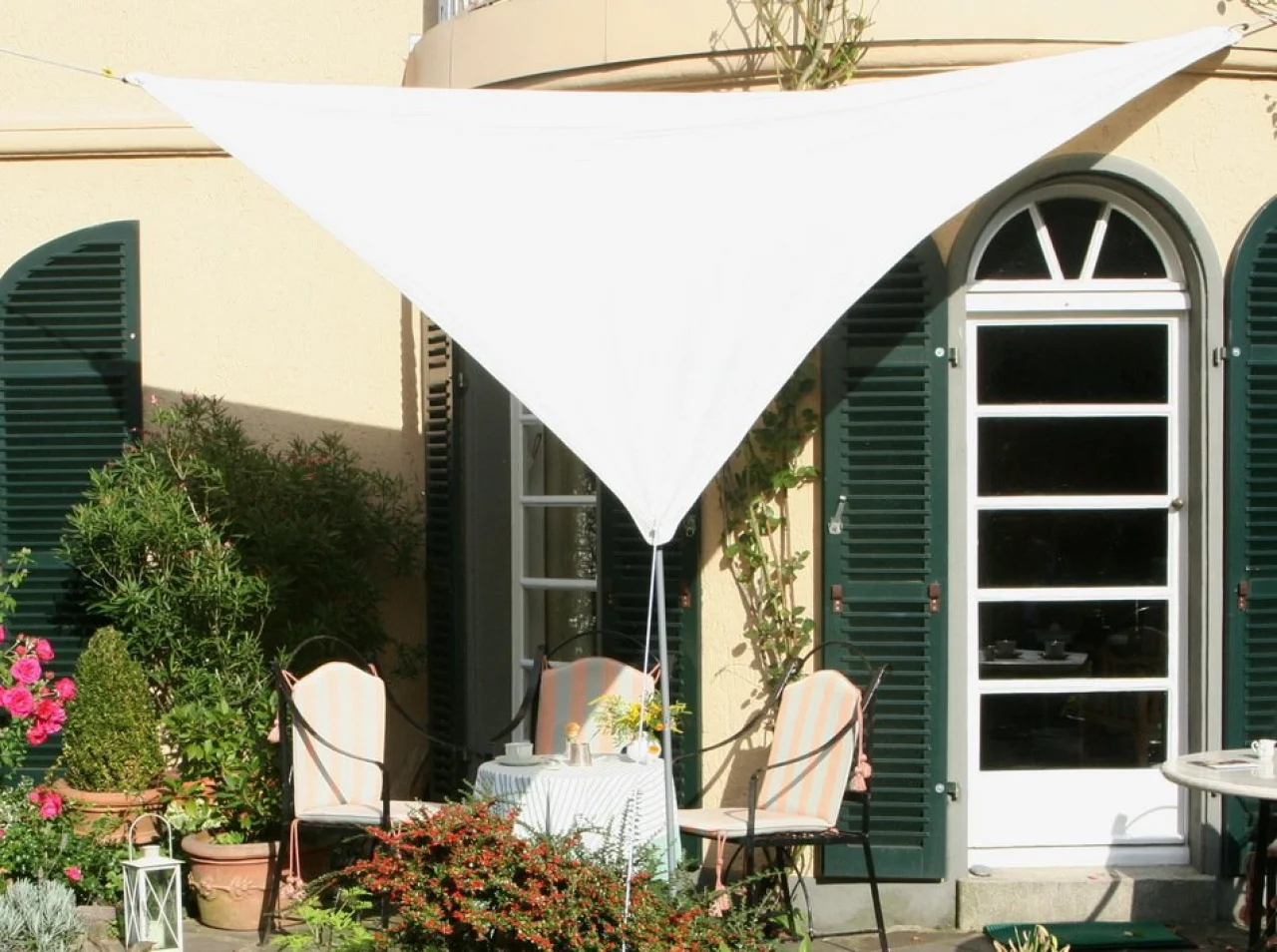 Dreiecksonnensegel werden meist mit einer Seite parallel zur Hauswand montiert