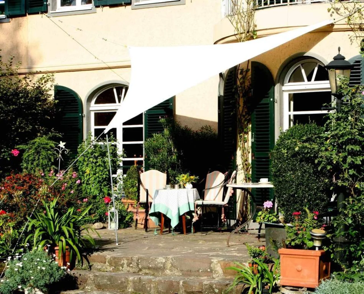 Dreiecksonnensegel oder Vierecksonnensegel werden meist mit einer Seite parallel zur Hauswand montiert.