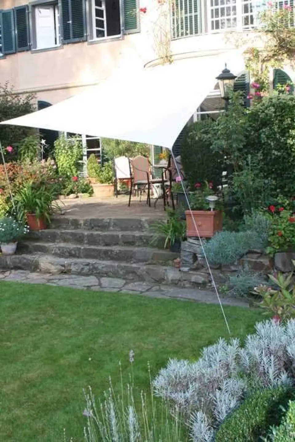 Ideal zur schnellen und vorübergehenden Aufstellung eines Dreiecksonnensegels im Garten oder in Richtung Garten von der Hausterrasse her, wenn die zwei hausseitigen Fixpunkte festliegen.