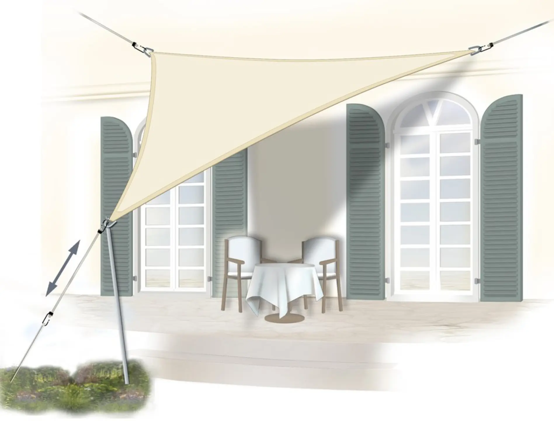 - Dreiecksonnensegel mit gleichfarbiger Randverstärkung; unterlegt mit schweren Gurten zum tragenden Metallring an der Ecken des Dreiecksonnensegels