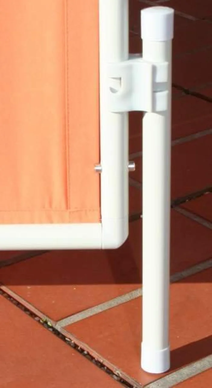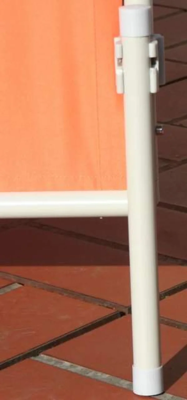 Werden mehrere Sichtschutz Paravent Rahmen z. B. auf einer Terrasse frei aufgestellt, wird die Standsicherheit durch Fußplatten ermöglicht, die an den beiden Enden einer Sichtschutzwand angesteckt sind. Damit die Rahmen in der Mitte nicht durchhängen und zusätzlich positioniert werden können, wird das Standrohr im Bereich der Mitte der Sichtschutzwand angesteckt.