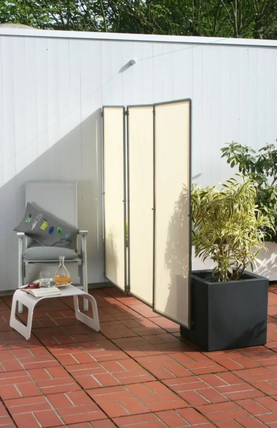 als leichter Windschutz ist dieser Paravent mit der Wandsicherung durch zwei Wand-Clips besonders geeignet, weil übliche Paravents völlig windinstabil sind und schon beim leichtesten Windhauch umfallen und Kinder gefährden können - leichten Wind hält der faltbare Paravent problemlos ab - ein Drehen läßt sich mit einer zusätzlichen Fußplatte oder einfach einem blockierenden Gartenstuhl verhindern - wichtig ist, daß der Paravent nicht kippen kann, das verhindern die Wand-Clips - bei Starkwind sollte man den Paravent ebenso sichern, wie einen Sonnenschirm