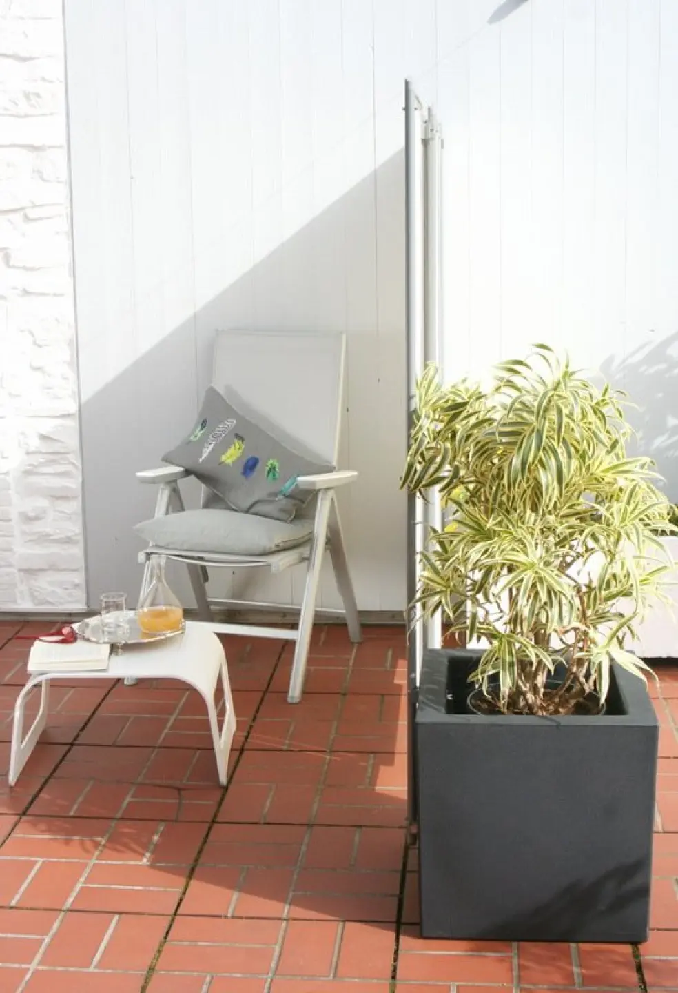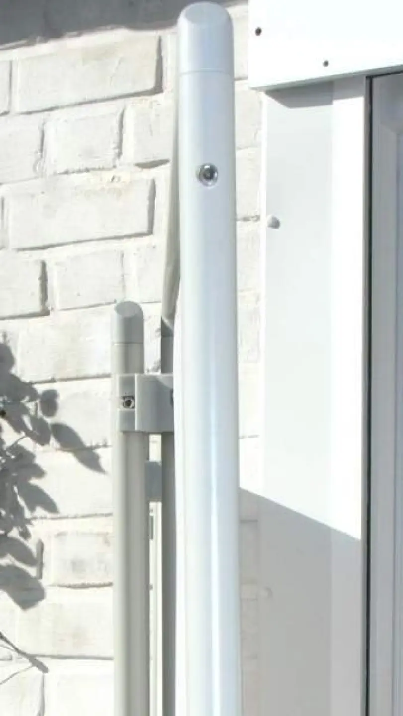 Die simple Steckverbindung greift immer auf Edelstahlzylinderschrauben, die sich oben und unten auf jedem langen Senkrechtteil der Rahmenelemente des Sichtschutz Paravents befinden.