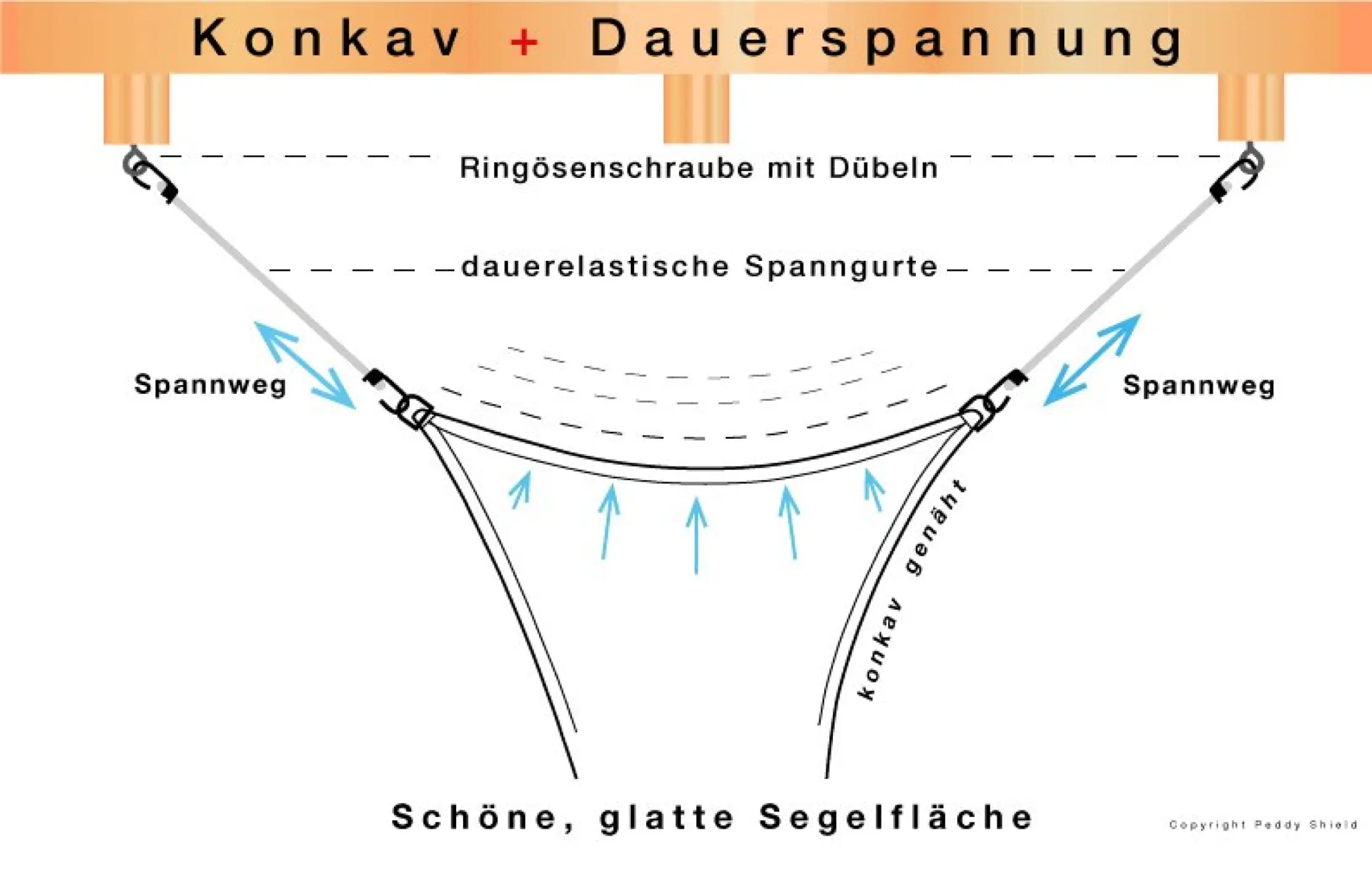 Durch den Zug an den Segelecken wird der Polyesterstoff aus der Segelmitte ausgezogen und gespannt, so daß die Segelmitte, die sonst eine tiefe Beule nach unten macht, dann schön glatt gespannt hängt.