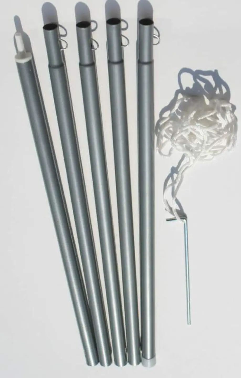 Geteilte Metallstange als Montagehilfe zum Aufstellen des Vierecksonnensegels, wenn ein dritter und auch vierter Fixpunkt fehlt.