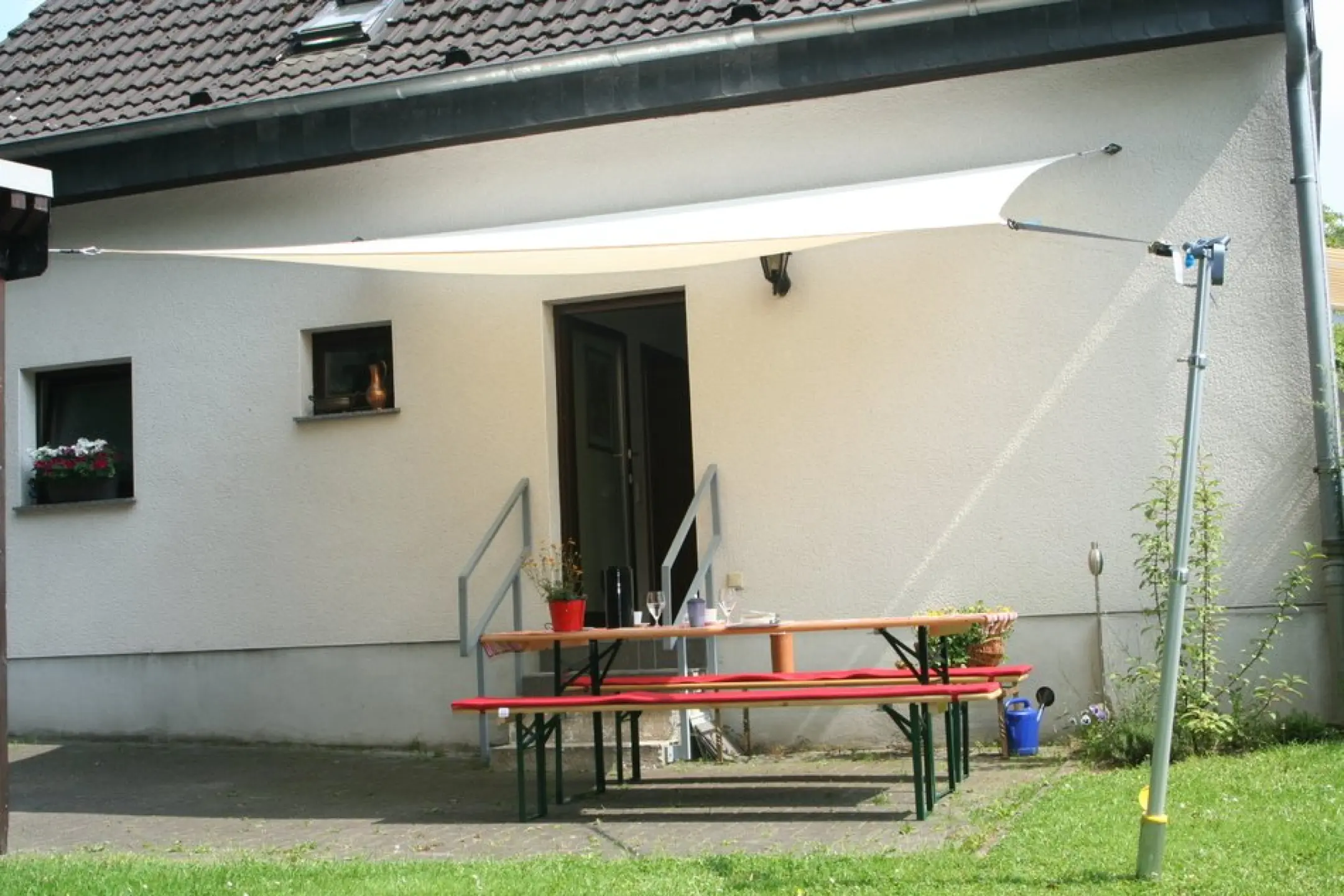 - kombinierter Sonnenschutz und Regenschutz - deshalb schräg aufhängen.