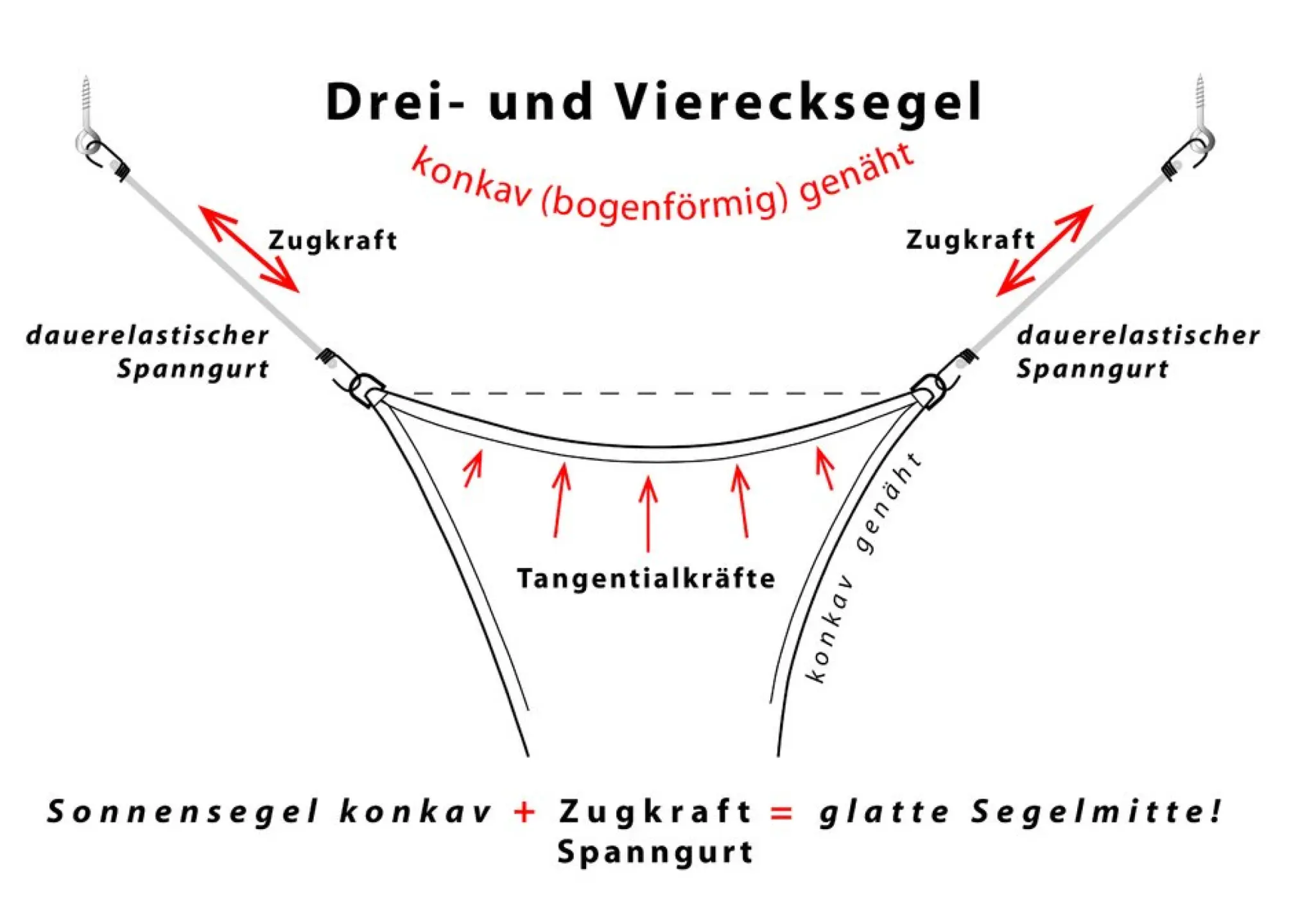 - Seiten zwischen den Segelecken sind bogenförmig geschnitten (konkav), damit durch die Dauerspannung der Spanngurte das Sonnenschutzsegel in der Mitte gerade gespannt ist und nicht durchhängt, was bei Regen zu problematischen Wassersäcken führen könnte.