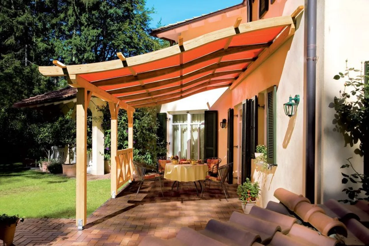 - Waschbares Sonnensegel, gespannt in Längsrichtung mit Hilfe von Tuchspannern