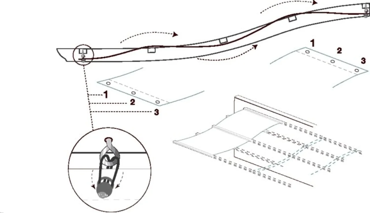 - die Laufhaken (dazu bestellen - den Laufhakenabstand können Sie frei wählen) werden dauerhaft auf den Randsaum des Sonnensegels geschraubt (rechtwinklig mit nicht-rostenden Edelstahlschrauben) - wir empfehlen einen Laufhakenabstand von 20 cm - so, daß das "geparkte Sonnensegel" unten nicht aus dem Fach heraushängt, also mit der Unterkante der Stoff-Falten innerhalb des Faches bleibt)