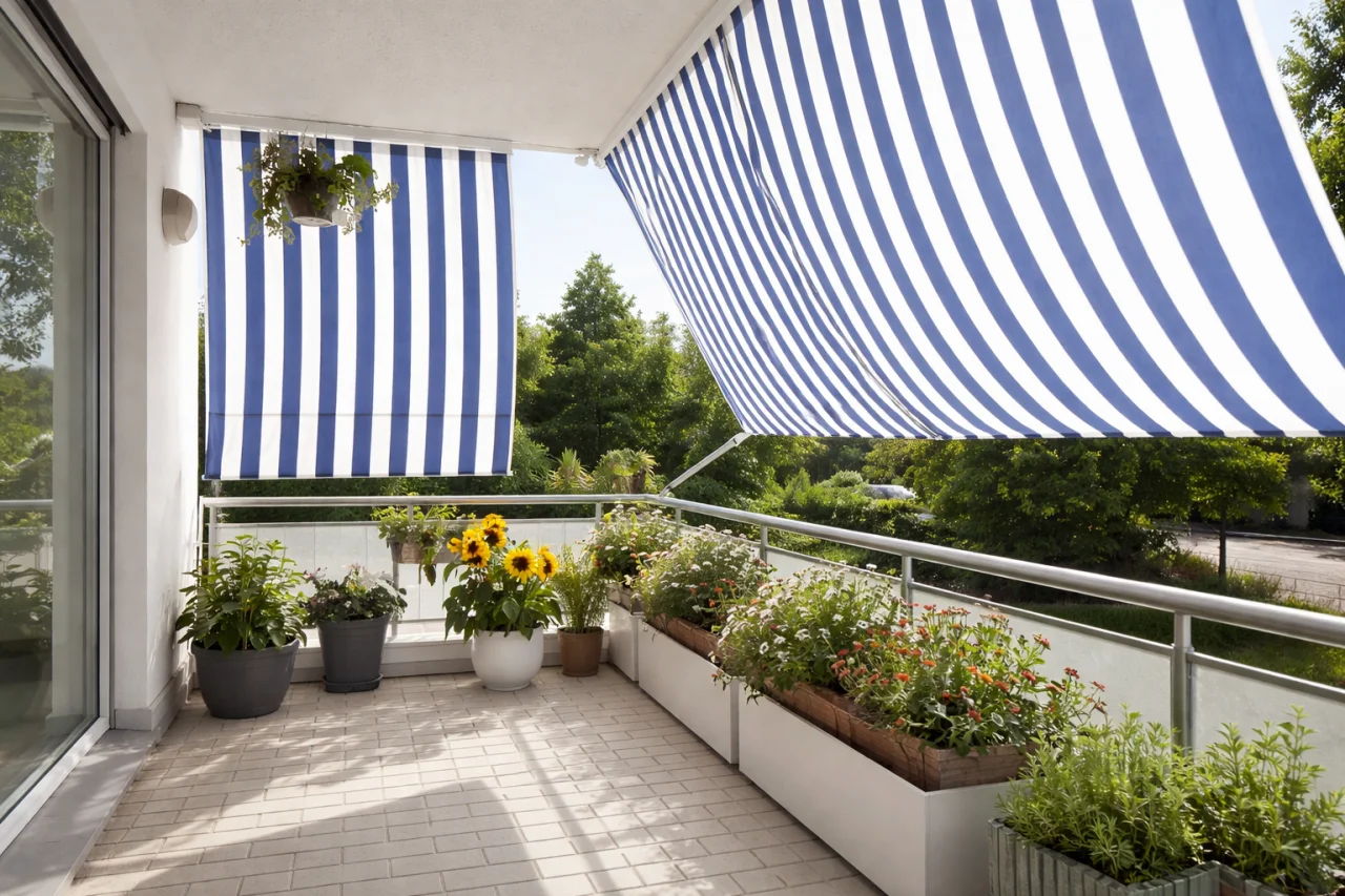 Das Sonnensegel 270 × 140 cm in Blau-weiß ist ein Faltsonnensegel für die Seilspanntechnik des Peddy-Shield-Systems und bietet zuverlässigen Sonnenschutz für Terrasse, Balkon oder unter Glasdächern.