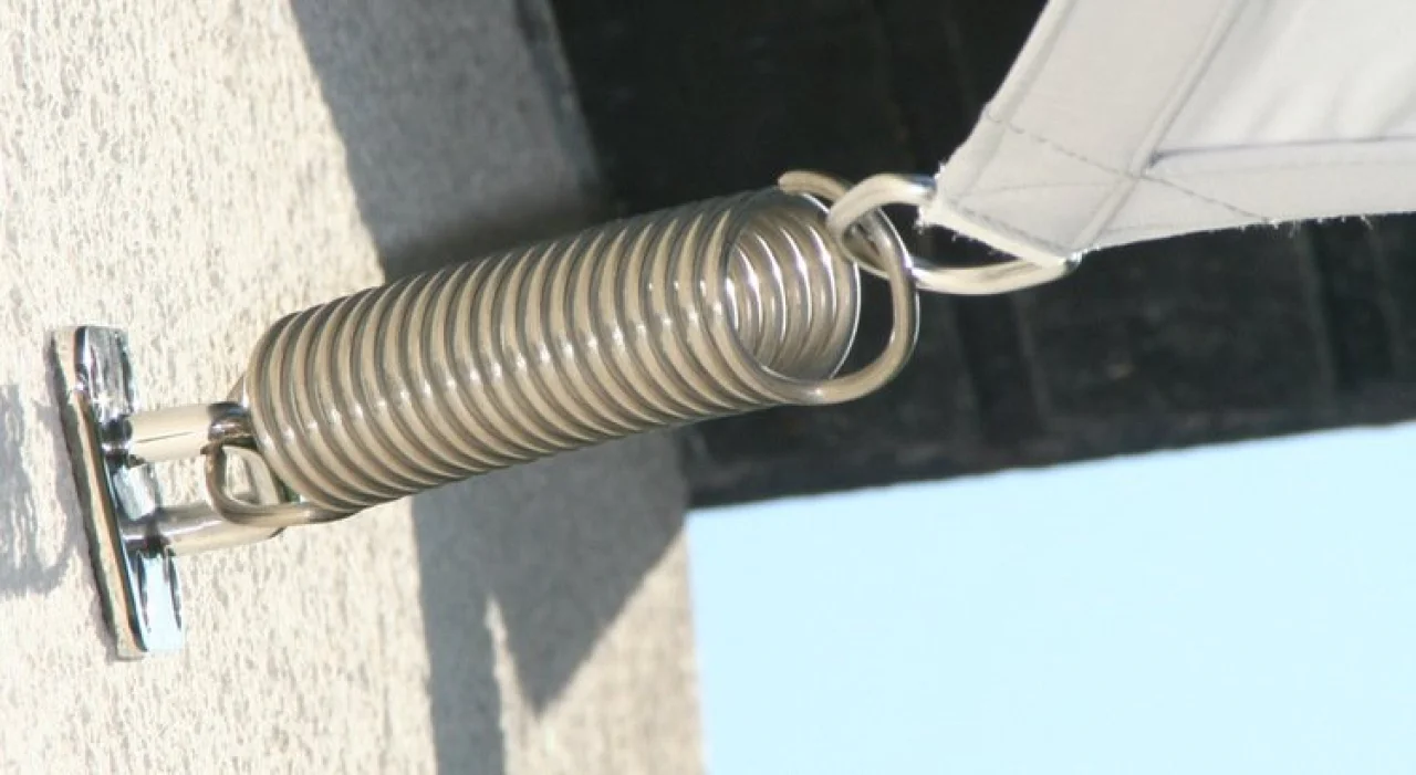 Diese besonders kompakte Zugfeder wurde speziell für die dauerelastische Befestigung konkaver Sonnensegel entwickelt. Sie sorgt für eine gleichmäßige Dauerspannung an den Segelecken und schützt das Sonnenschutzsegel zuverlässig vor schädlichen Windspitzen. Gleichzeitig bleibt durch die kurze Bauform der Abstand zwischen Hauswand und Segel gering – ideal für die hausnahe Montage, damit sich kein Regenloch bilden kann.