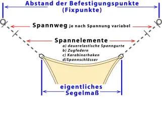 Hinweis: Zwischen Segelecke und Befestigungspunkt immer ausreichend Platz für Spannelemente einplanen – Sonnensegel müssen dauerhaft unter Spannung stehen.