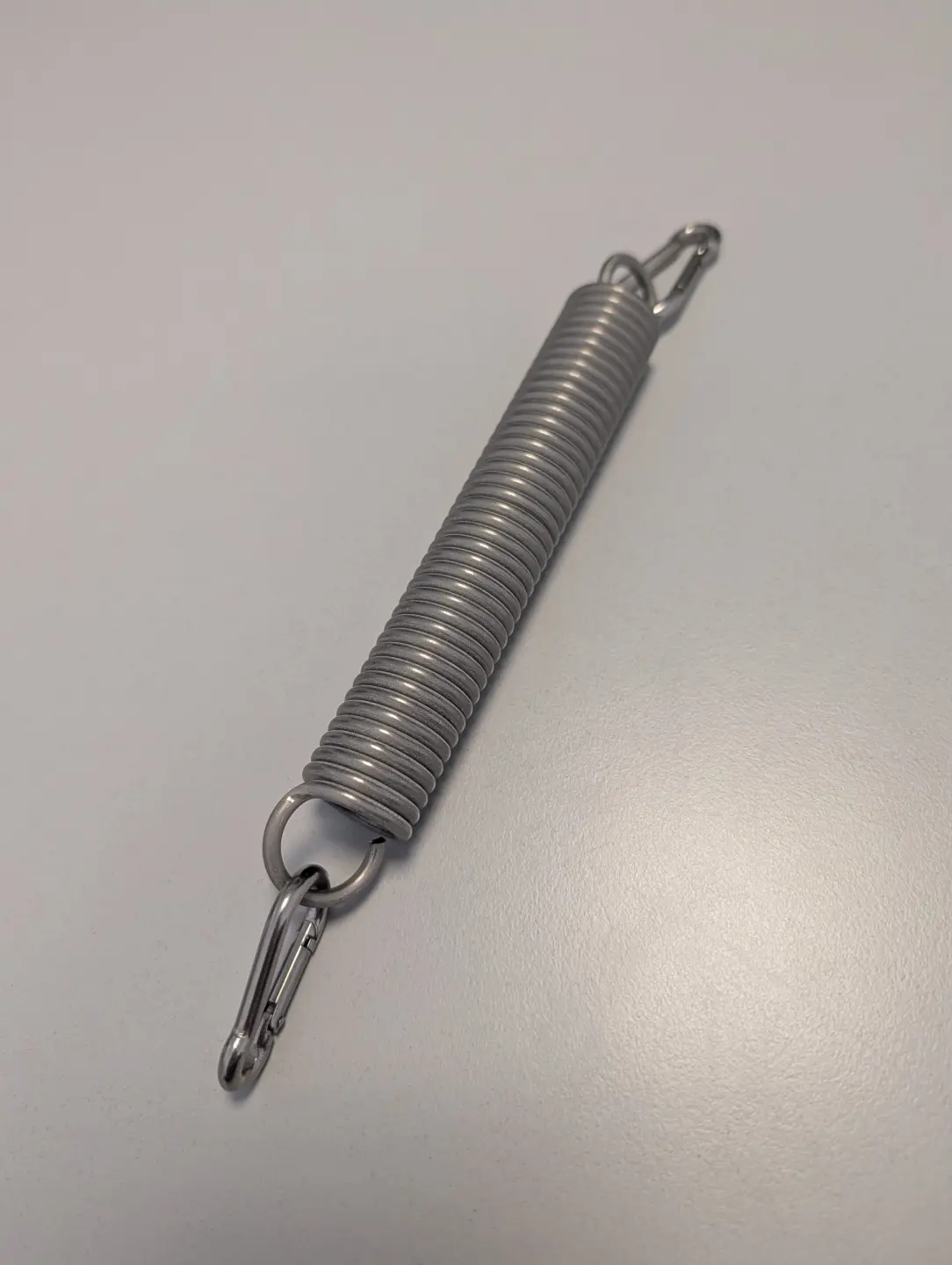 Edelstahl Zugfeder besonders kurz mit einer Grundlänge 15,8 cm - unter Spannung bis ca. 26,99 cm lang.